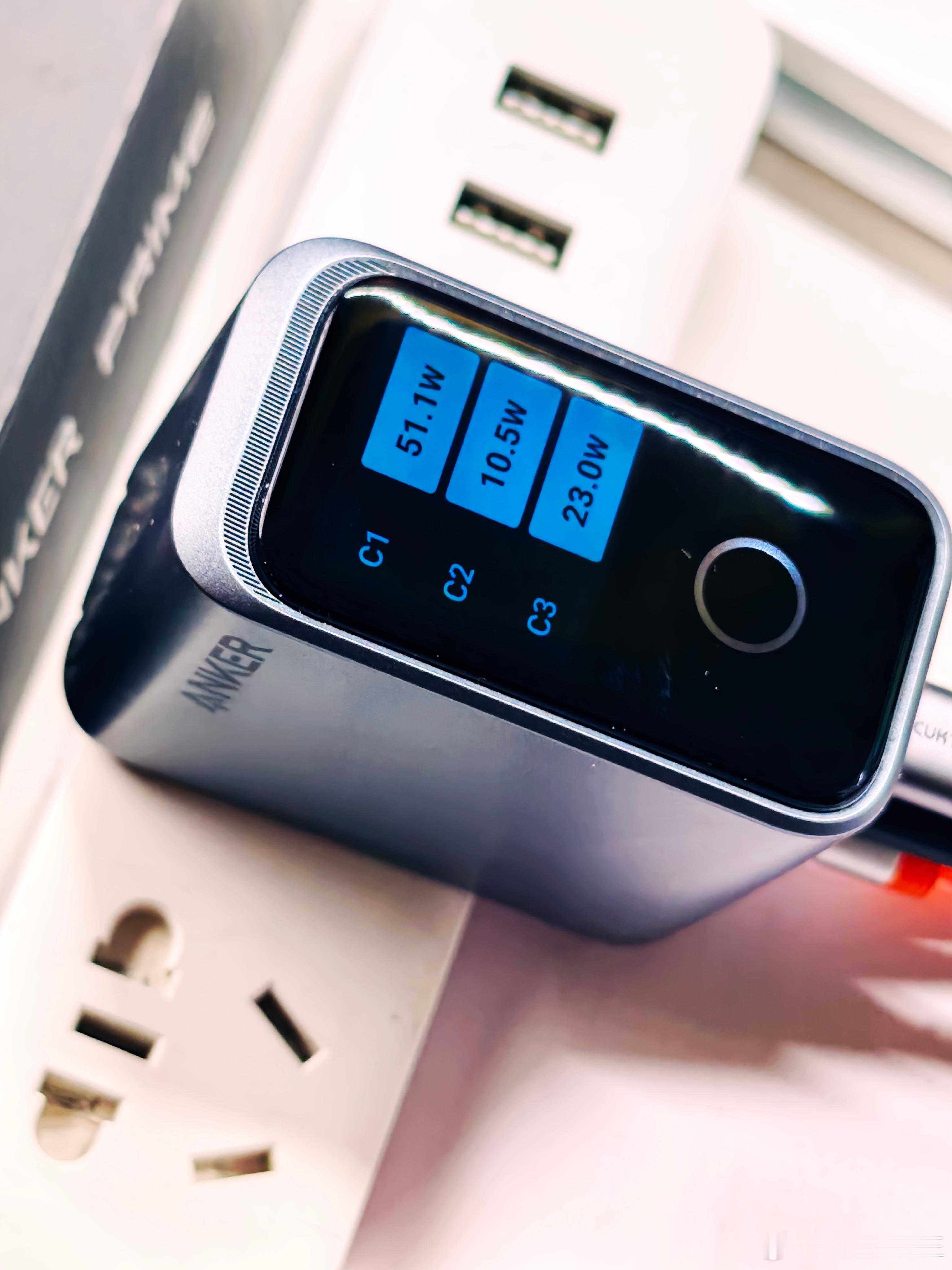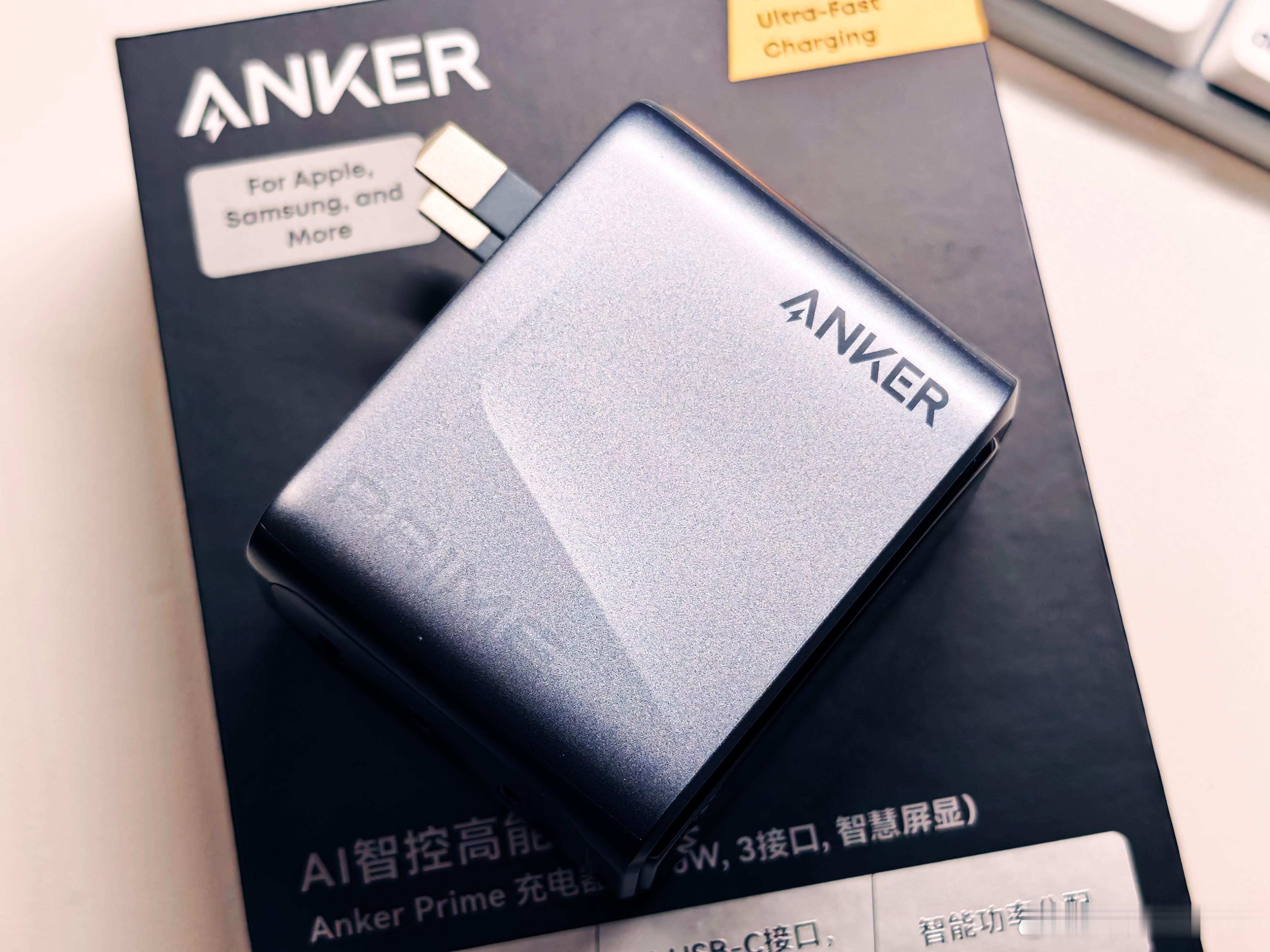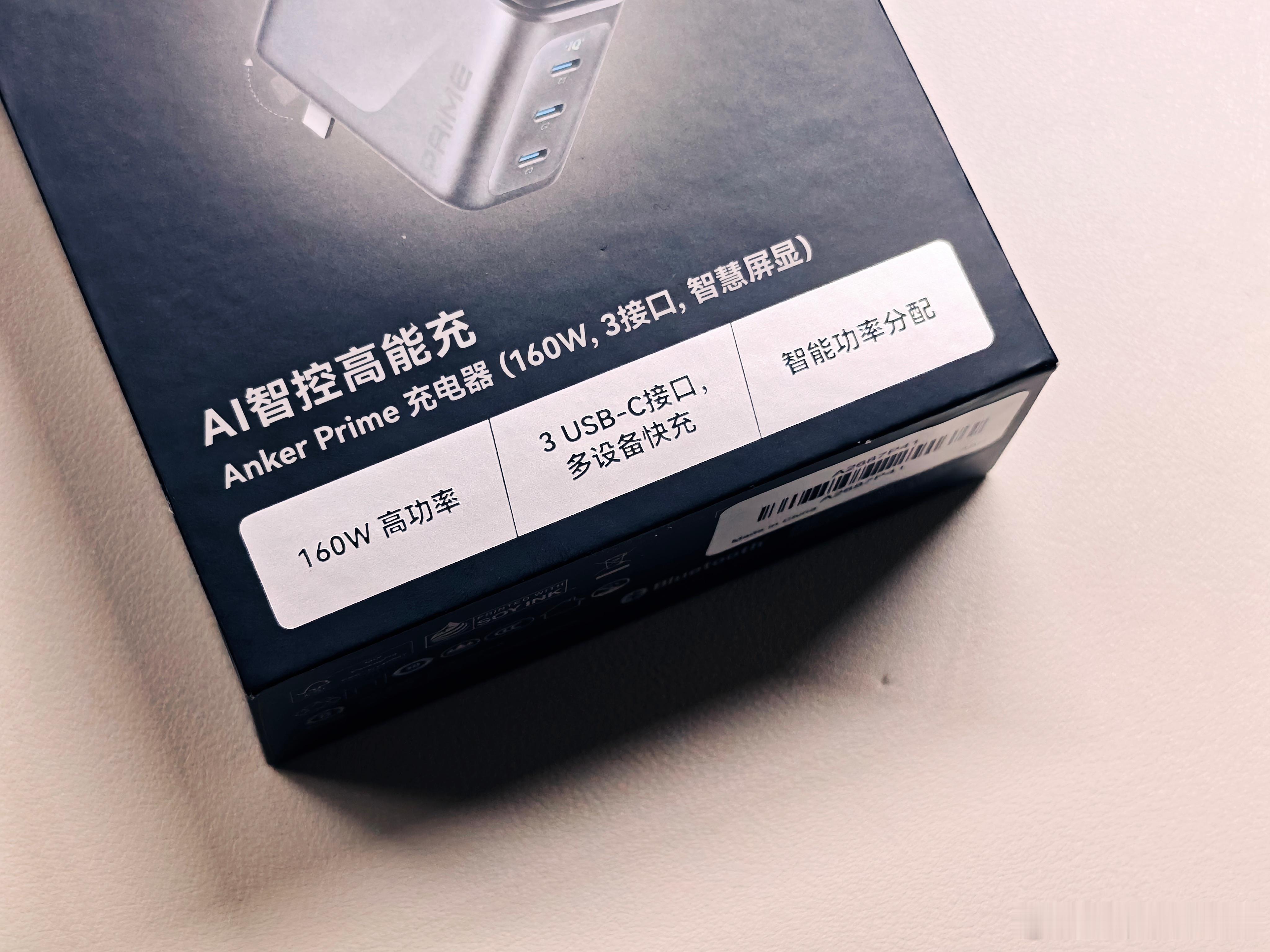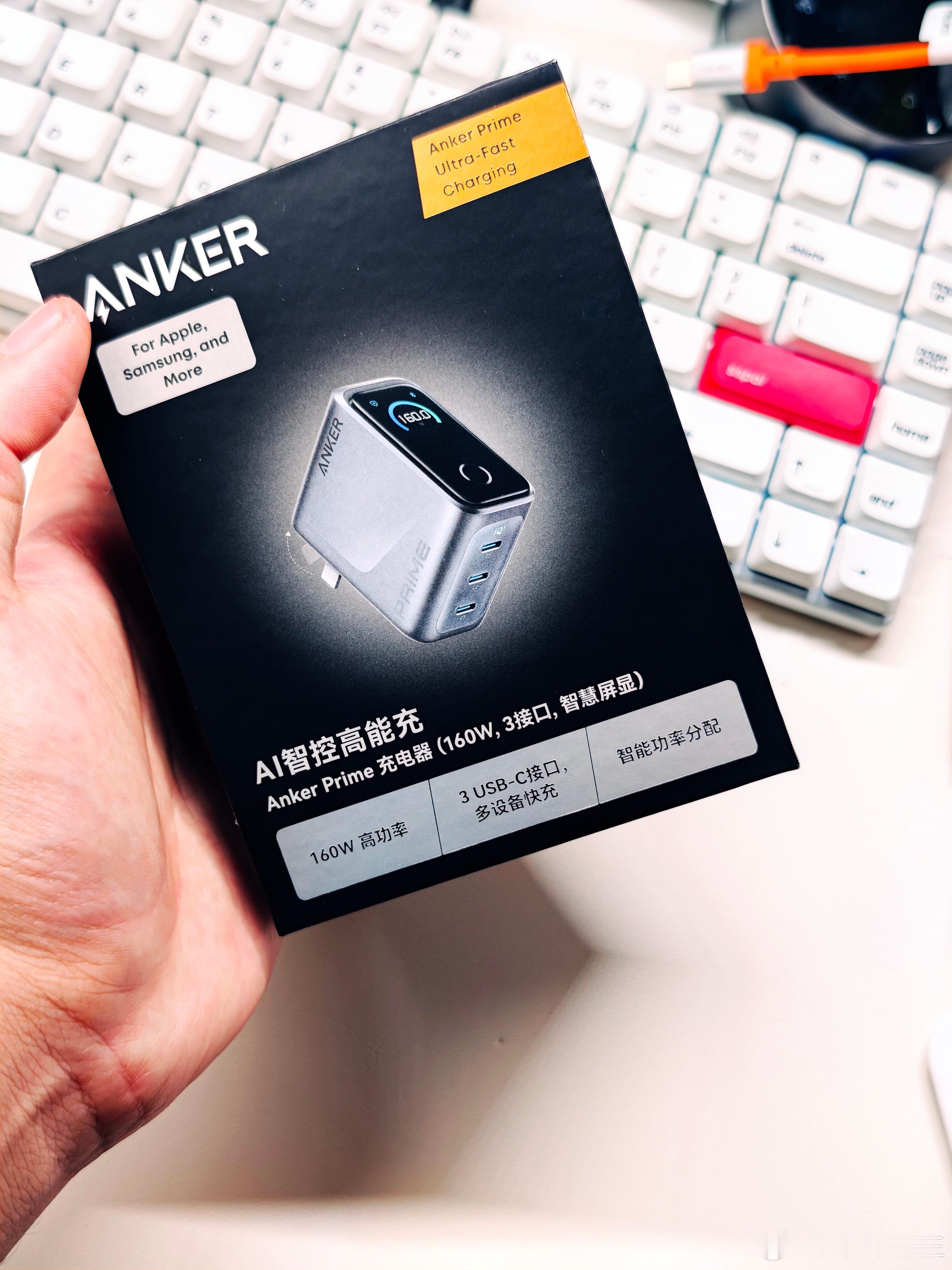 应该是年度收官的超强快充头了 Anker Prime 160W 智显充 Pro用了段时间觉得挺适配多设备日常的单口 140W 能 24 小时不降速输出,总功率 160W,平时充笔电、手机、平板一起插也很稳。AI 会自动分配功率,不用手动调,省了不少折腾的功夫。氮化镓技术把体积做的挺小巧,比原装的大功率充电器小不少,桌面摆着不占地,出门带也不占包。还有智显屏能看实时功率和温度,细节做得挺到位,日常用着很顺手。