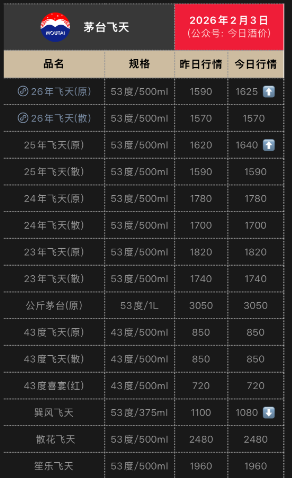 值得注意的是,2月3日今日酒价数据显示,2026年与2025年飞天茅台价格全线走高,2026年飞天茅台原箱报价1625元/瓶,较前一日上涨35元;2025年飞天茅台原箱报价1640元/瓶,单日上涨20元。