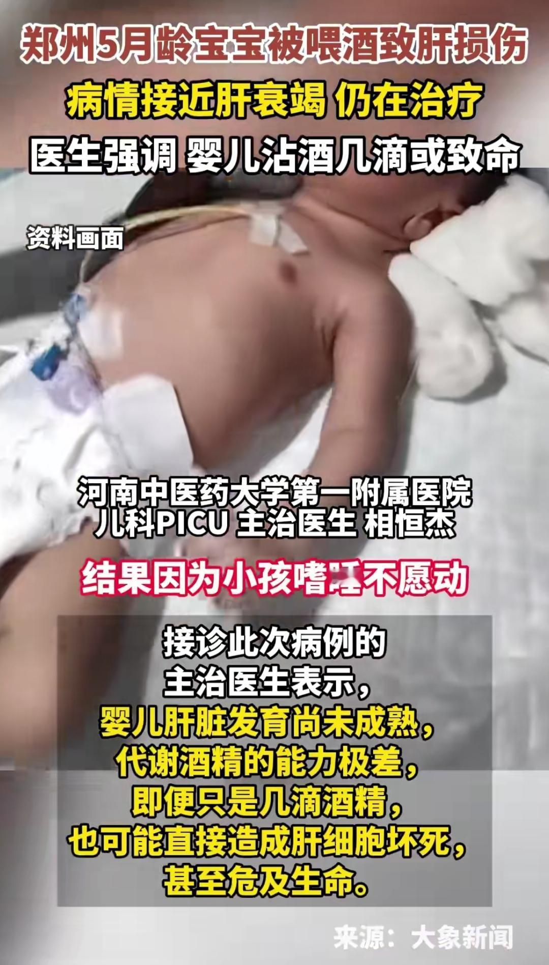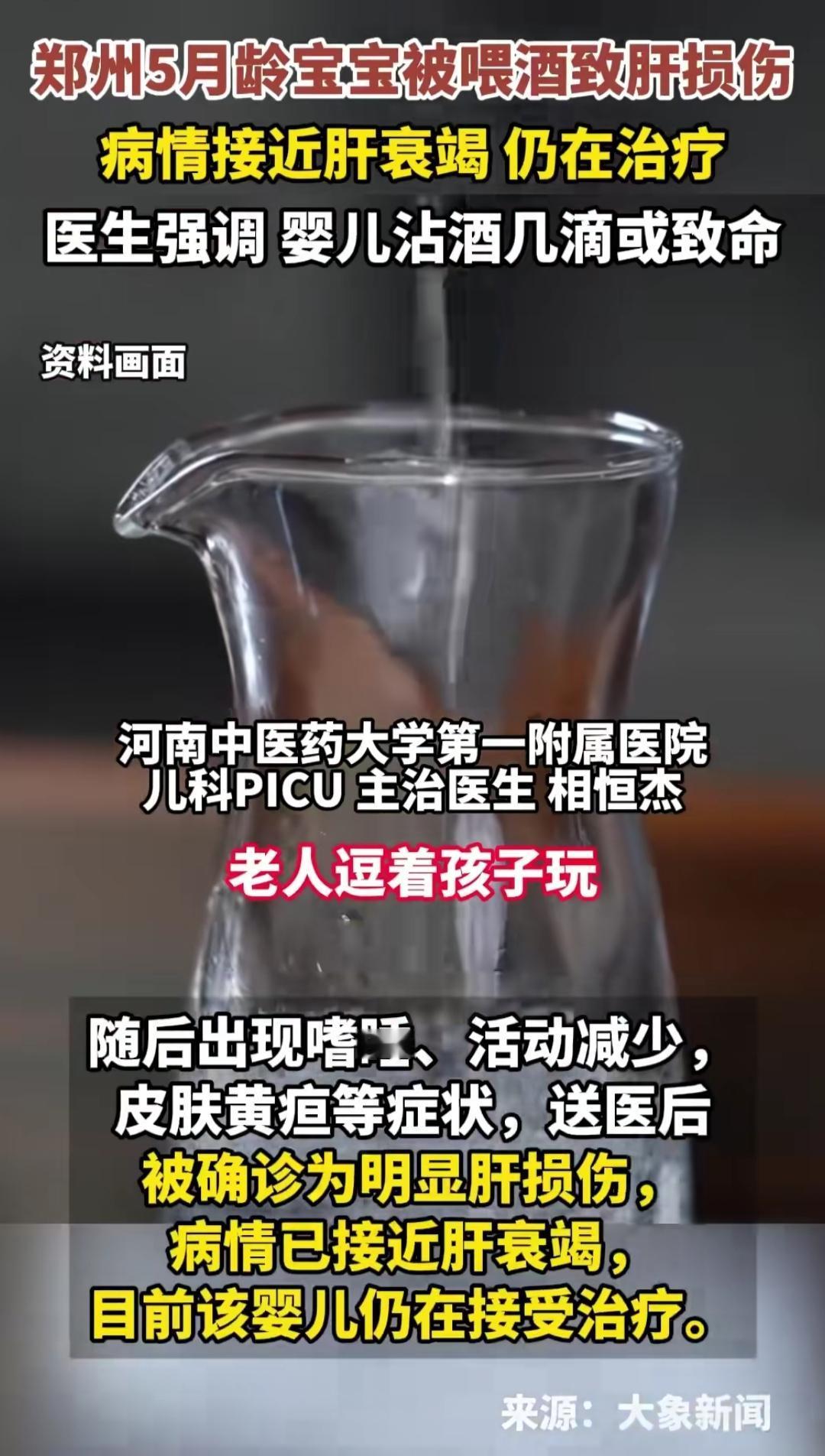 谁能想到,饭桌上一个看似平常的逗娃举动,竟让一个5月龄的宝宝住进医院,直面肝衰竭的危险。河南郑州这起揪心的事,戳中了多少家长的软肋,也让大家重新审视那些习以为常的育儿方式。 老人用筷子蘸了酒喂宝宝尝,不过几次,孩子就开始嗜睡、皮肤发黄,送医后确诊严重肝损伤。宝宝的肝脏还未发育成熟,代谢酒精的能力只有成人的三分之一,几滴酒对他们而言,就像一剂难以承受的毒药。 这样的事并非个例,各地都有因喂娃喝酒引发的意外,有人觉得只是逗乐,有人抱着“从小练酒量”的想法,却忽略了孩子娇嫩的身体根本经不起这样的试探。每一个小生命的成长,都藏着无数需要小心守护的细节。 春节临近,家庭聚餐越来越多,这样的场景可能还会出现。面对身边那些看似充满爱意的逗娃行为,该如何把握分寸,守护好孩子的健康,值得每个人好好思考。