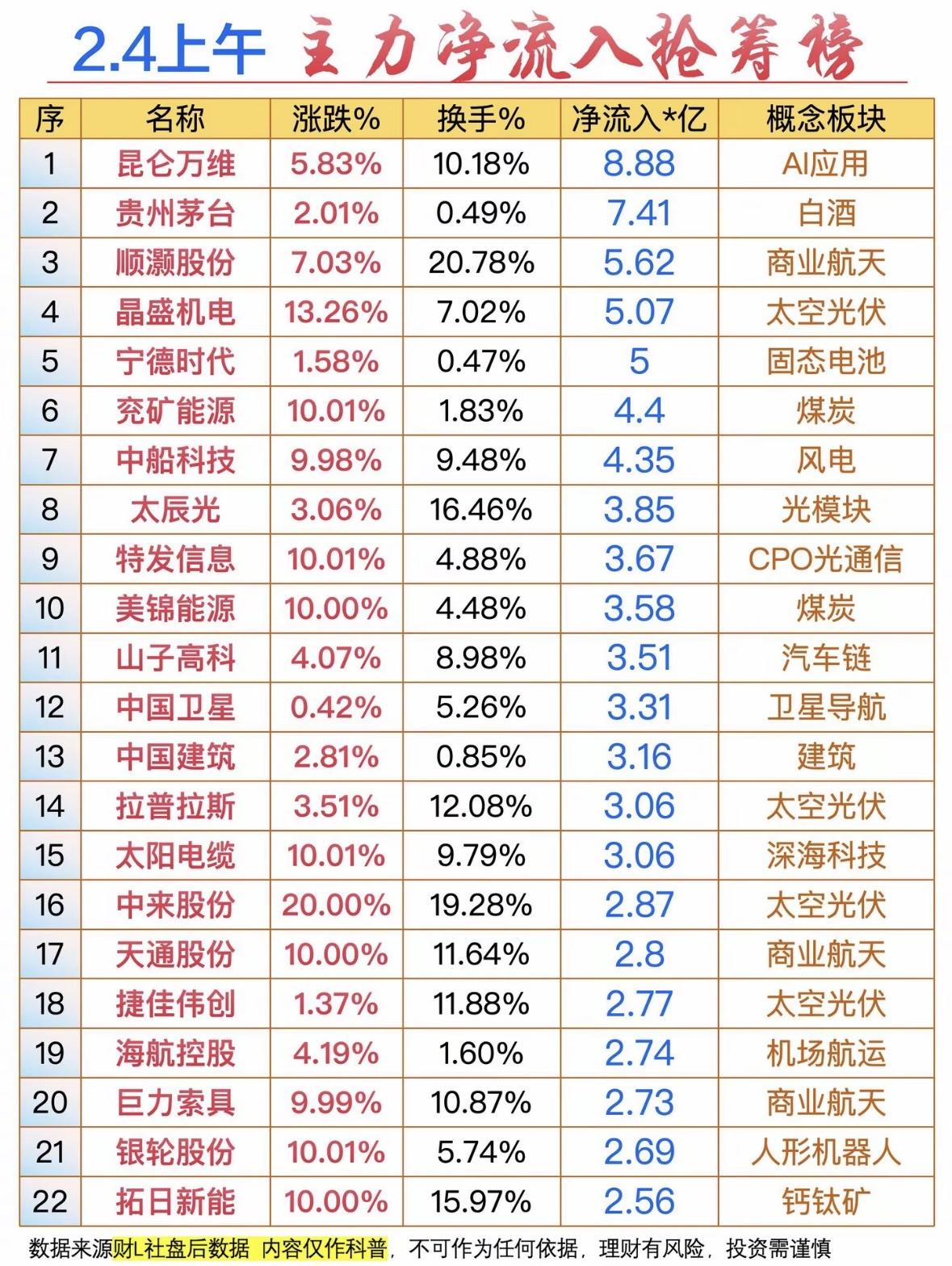 2.4上午主力净流入抢筹榜,强势概念股一览! AI应用、白酒、商业航天领涨,风电光伏活跃,主力抢筹新能源与科技板块。投资需谨慎。