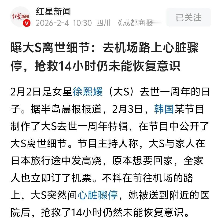 韩媒曝大S离世前的细节?去机场赶回台湾的途中,心脏骤停了,在附近的医院抢救14个小时,仍然未能恢复意识。她的离世不光是因为流感引发的肺炎,她有基础病。有心脏方面的病,还有癫痫。之前吴佩慈说,大S和她在一起练瑜伽的时候都曾经癫痫发作过。生孩子的时候也发作过。她和汪小菲在一起的时候,咳嗽一声,他都紧张。有几次都度过了生命危险,如果没有分开,就不会是这样的结局。