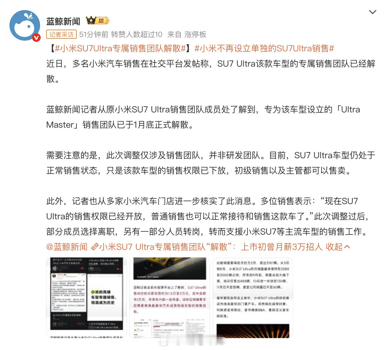 小米SU7Ultra专属销售团队解散 只是销售团队解散,也就是说普通销售现在也能卖 SU7 Ultra 了,而 SU7 Ultra 的研发团队不受影响。