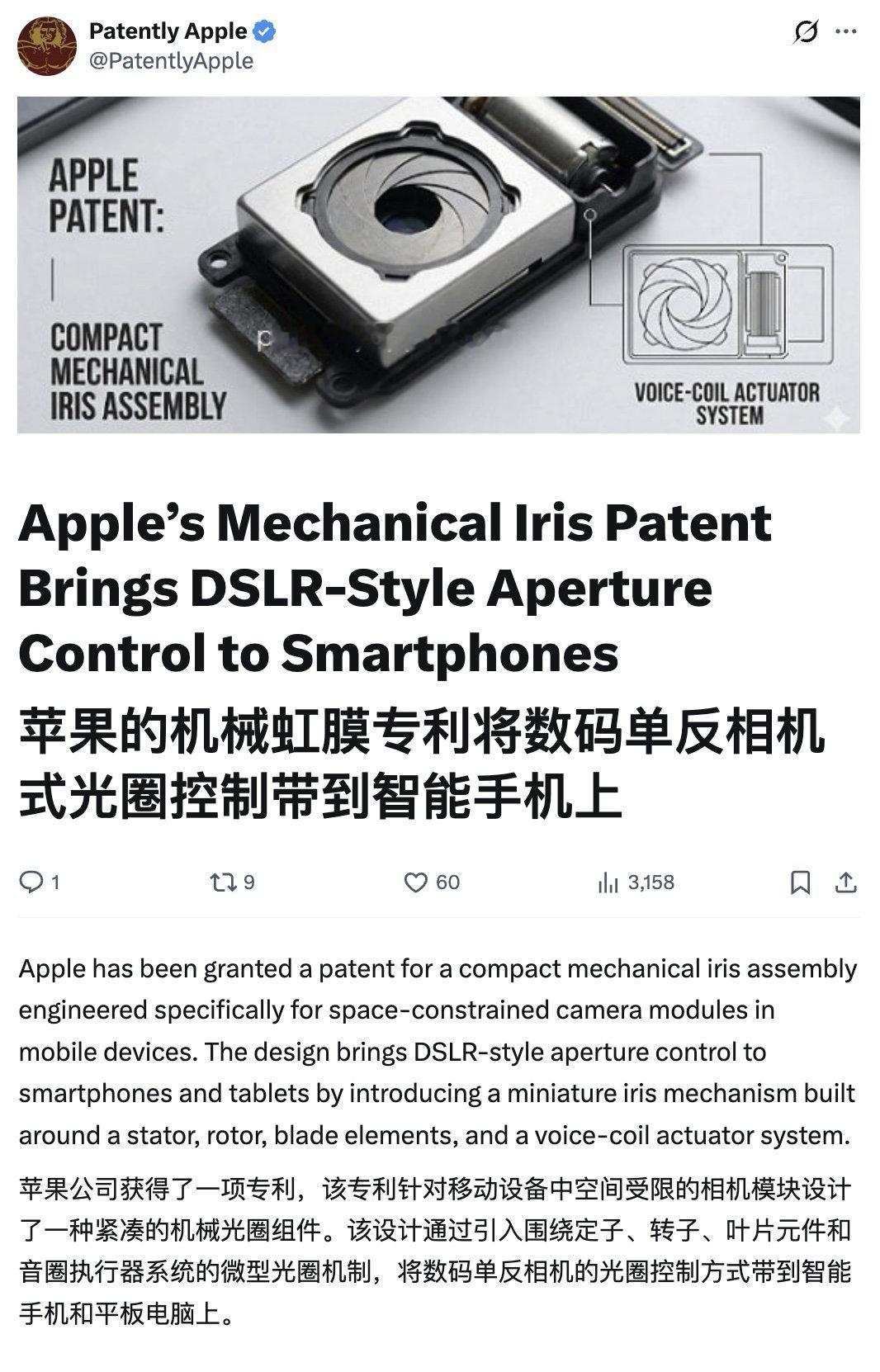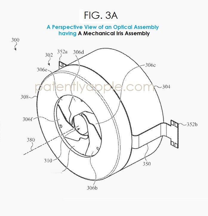 iPhone 相机的可变光圈专利。苹果的解决方案将光圈微型化,使用弹簧在运动和静