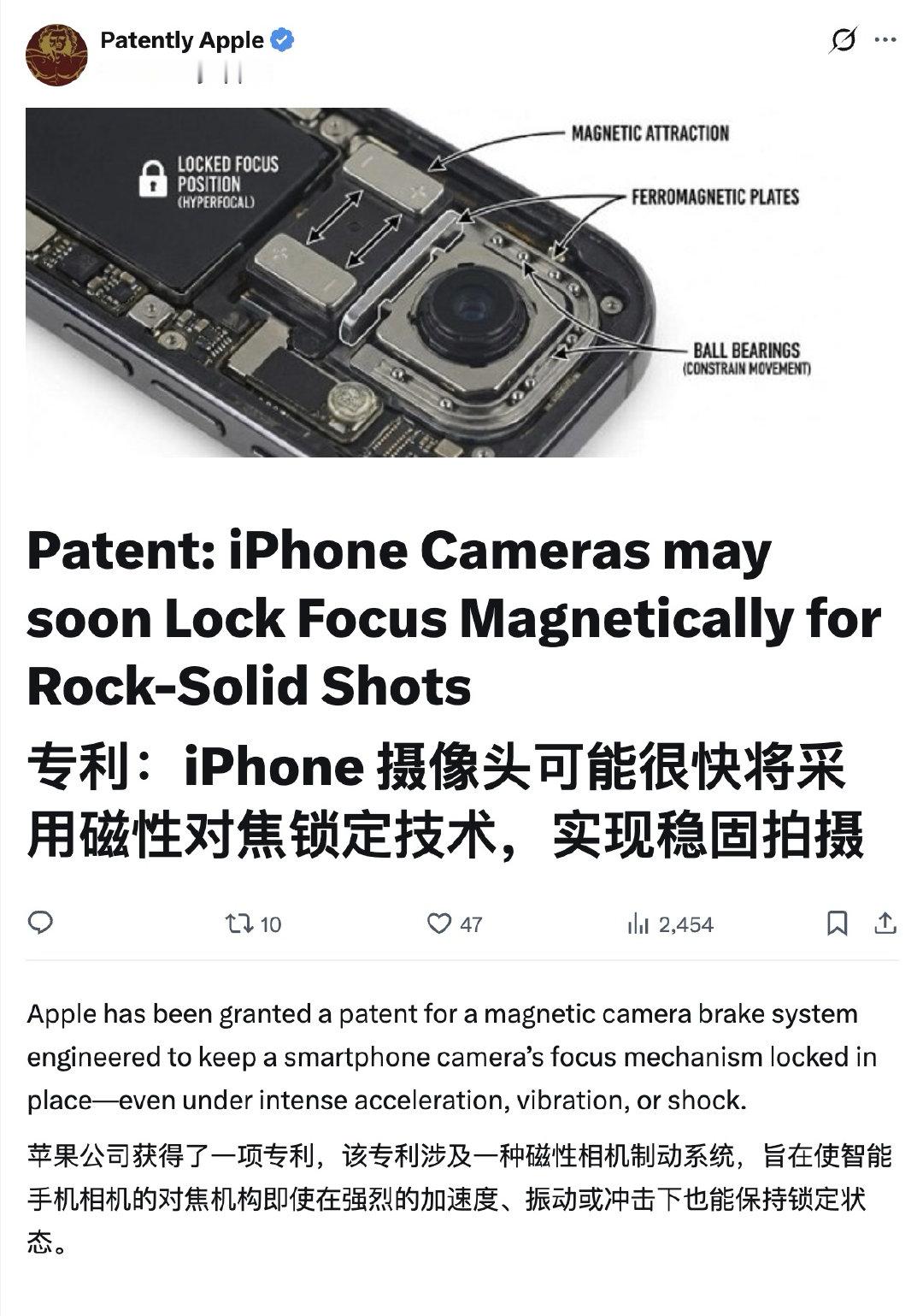 iPhone 相机磁性对焦锁定技术专利。(可以抵抗约 10 g 的外部加速度)解决移动自动对焦系统的一个长期存在的弱点:当暴露在高频振动或突然冲击时,它们可能会漂移、晃动或失去校准,导致图像模糊或视频抖动。by PatentlyApple