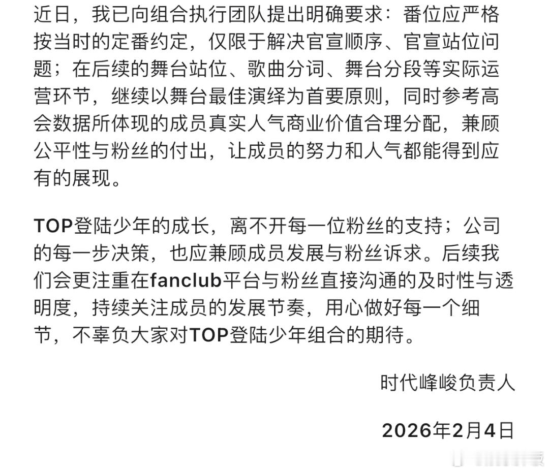 时代峰峻回应top番位问题 时代峰峻刚刚发声明回应了top登陆少年组合的番位争议问题,按照这个意思应该是分词包括后面的外务也全看高会,再简单点就是,你不花钱那就让你担一直抠脚感觉时代峰峻发这个无非就是让粉圈互撕有更好的话语权和素材逼着top的粉丝打钱,毕竟他们停氪真的挺严重的非正式跨年派对2025微博之夜爆款创作大赛