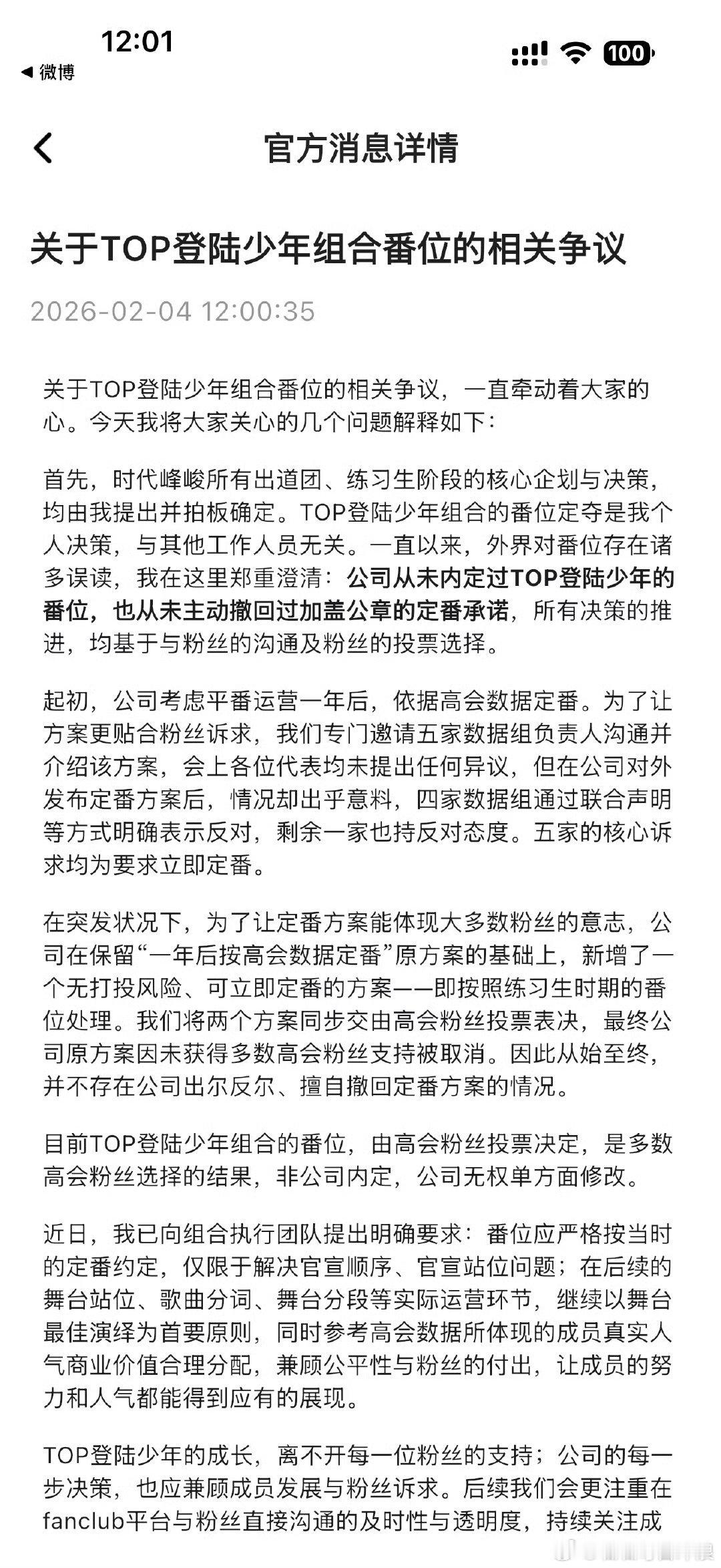 时代峰峻刚刚发的top登陆少年番位的说明,这意思就是网传内定番位为假,不会换番?