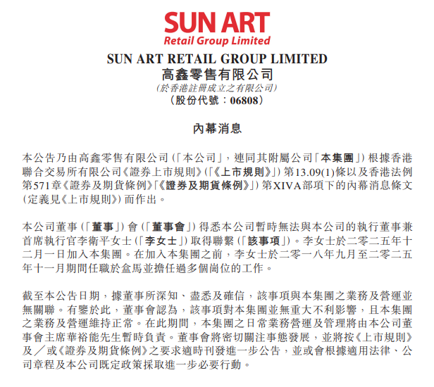 公告显示,李卫平于2025年12月1日正式加盟高鑫零售,距今尚不足三个月。在此之前,她自2018年9月至2025年11月长期任职于阿里巴巴旗下新零售标杆——盒马,历任多个关键岗位,被视为阿里系零售体系中的核心干将。其空降高鑫,本被市场解读为阿里进一步整合线下商超资源、推动高鑫转型的重要信号。然而,短短数周后便“失联”,不仅打乱了高鑫的战略节奏,更在资本市场投下巨大问号。
