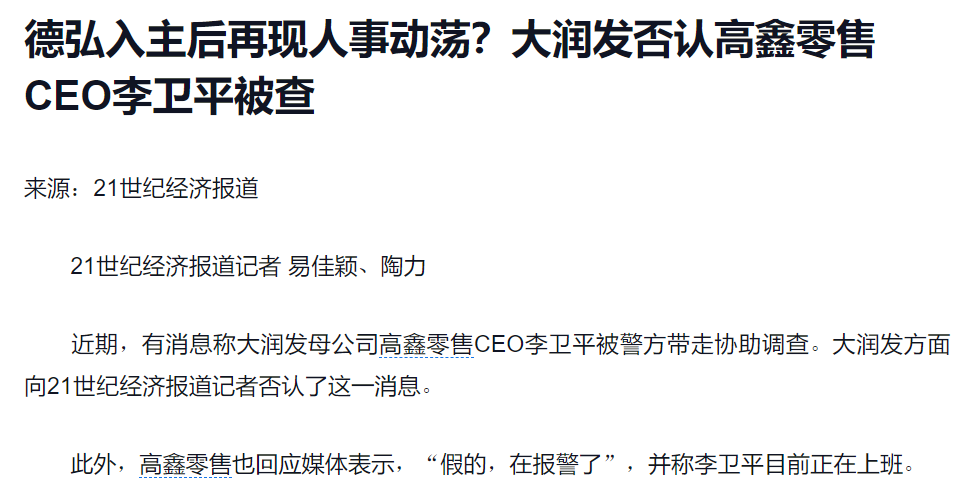 昨晚,妖妖灵还在想,高鑫零售(06808.HK)首席执行官李卫平被警方带走协助调查的传闻如此发酵,那么大的事情,高鑫零售怎么没有发公告,而只是对媒体否认相关传言,直言“假的,在报警了”,并强调“李卫平目前正在上班”。