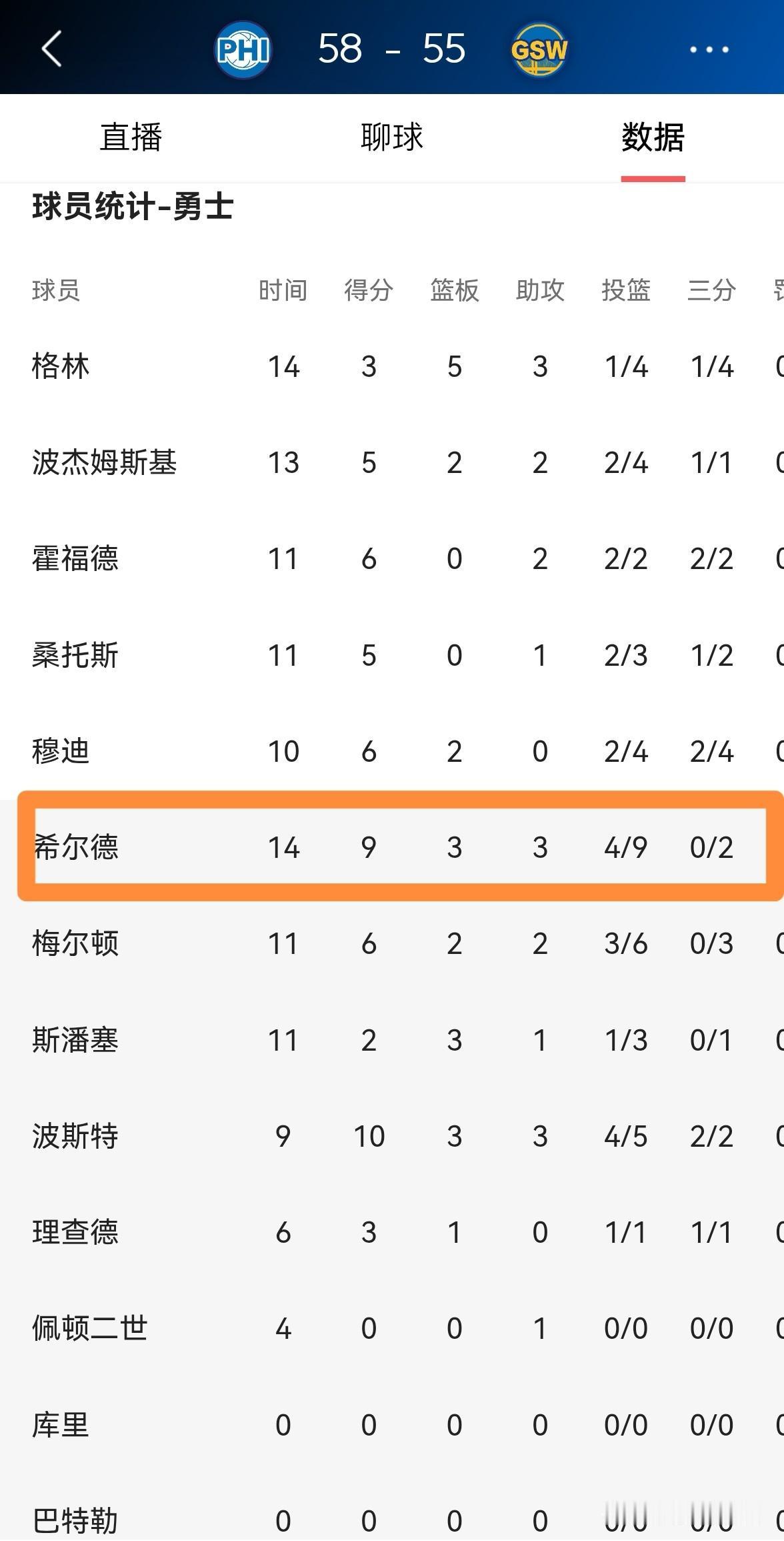 勇士大将希尔德终于把握住机会了!在今天进行的勇士和76人的比赛中,目前两队的上半