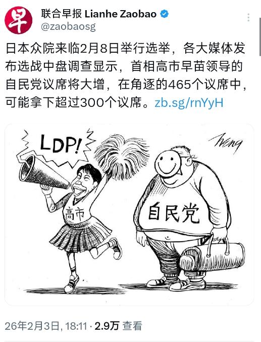 新加坡联合早报昨晚(2月3日晚)写道:“日本众院来临2月8日举行选举,各大媒体发布选战中盘调查显示,首相高市早苗领导的自民党议席将大增,在角逐的465个议席中,可能拿下超过300个议席。” 日本这轮众议院选举,看着像提前写好的剧本。高市早苗去年底还被经济疲软拖后腿,突然在国会开幕日解散众议院,打了所有人一个措手不及。 在野党本来准备揪住"统一教会"丑闻猛攻,结果选战16天闪电启动,连候选人名单都没捂热乎,农村选区的后援会网络根本转不起来。北海道大雪封路那天,立宪民主党候选人对着空荡的街道叹气——他们的传统票仓,就这么被天气和时间吃掉了。 自民党这次赢在"稳"和"快"。289个小选区里,富山、鸟取这些保守老巢直接包揽全部席位,农村大爷大妈认的不是政策是熟面孔。 高市团队更绝,把选举变成"心理战":她本人以"带伤参选"人设跑基层,闭口不谈消费税,专打"守护日本"的情绪牌。 年轻人看不懂历史争议,但听多了"外部威胁"论调,反而觉得这个首相"能扛事"。中道改革联合刚合并就内讧,支持率还没自民党零头高,选民连新党名字都记不住,投票时只能顺着老牌子划。 最关键的是议席数字的门道。233席是执政底线,261席能卡死所有委员会,310席直接解锁修宪副本。现在民调显示自民党单独冲300,加上维新会直奔三分之二。这意味着什么? 以后国会里没人能拦着高市早苗——参议院否决的法案,众议院可以硬怼回去;修宪提案只要过了众议院,哪怕参议院反对也能启动公投。 战后日本第一次出现这么集中的权力,连自民党内的温和派都慌了神,石破茂公开呛声"发钱不如涨工资",可基层后援会早就被高市的激进路线绑死了。 选票背后是日本社会的右转。维新会加入执政联盟后,关西保守票仓彻底盘活,两党在113个选区"同室操戈"反而没影响,因为选民宁可投保守派也不碰在野党。 30岁以下选民支持率意外走高,不是认同政策,而是被"强硬"标签吸引。 这种情绪推着高市往更激进的方向走——选前她再次涉台表态,明摆着要用对华强硬巩固基本盘。反正议席够多,就算得罪中国,国内右翼选民只会更死心塌地。 但数字游戏也有隐患。自民党赢了289个小选区,靠的是1万票以内的微弱优势,85个选区还和维新会窝里斗。更要命的是党内分裂,麻生太郎这些大佬被蒙在鼓里,基层后援会抱怨"政策太冒险"。 要是真拿到310席,高市修宪的手会抖得更厉害——自卫队写入宪法第九条,意味着战后秩序撕开缺口,周边国家不可能坐视。可日本选民现在顾不上这些,他们只看到自民党承诺的"稳定",却不知道这种稳定,正在把国家推向更危险的弯道。 这场选举没有悬念,悬念在于拿到绝对权力的高市,会把日本开向哪里。经济上她暂免消费税的法子治标不治本,安全上却可能加速"再军事化",东海、台海的动作只会越来越多。 最吊诡的是,自民党竞选纲领写着"与中国稳定关系",转头就推进稀土脱钩——这种矛盾,恰恰是日本右翼政客的生存之道:用对华强硬捞选票,用经济依赖做遮羞布。只是苦了夹在中间的企业,稀土供应链60%依赖中国,真要硬脱钩,丰田的生产线先得停摆。 说到底,这不是高市早苗一个人的胜利,而是日本保守势力借"外部威胁"完成的一次权力收割。465个议席里,300席的重量不是数字,是战后秩序的裂痕。当制衡消失,当反对声音沉默,这个国家的方向盘,就彻底交到了敢赌国运的人手里。