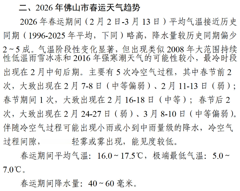 预计2026年春运期间我市平均气温接近历史同期略高,降水量偏少2~5成,期间有5次冷空气过程。气温阶段性变化显著,出现类似2008年大范围持续性低温雨雪冰冻和2016年强寒潮天气的可能性较小,气象条件对春运总体影响小。