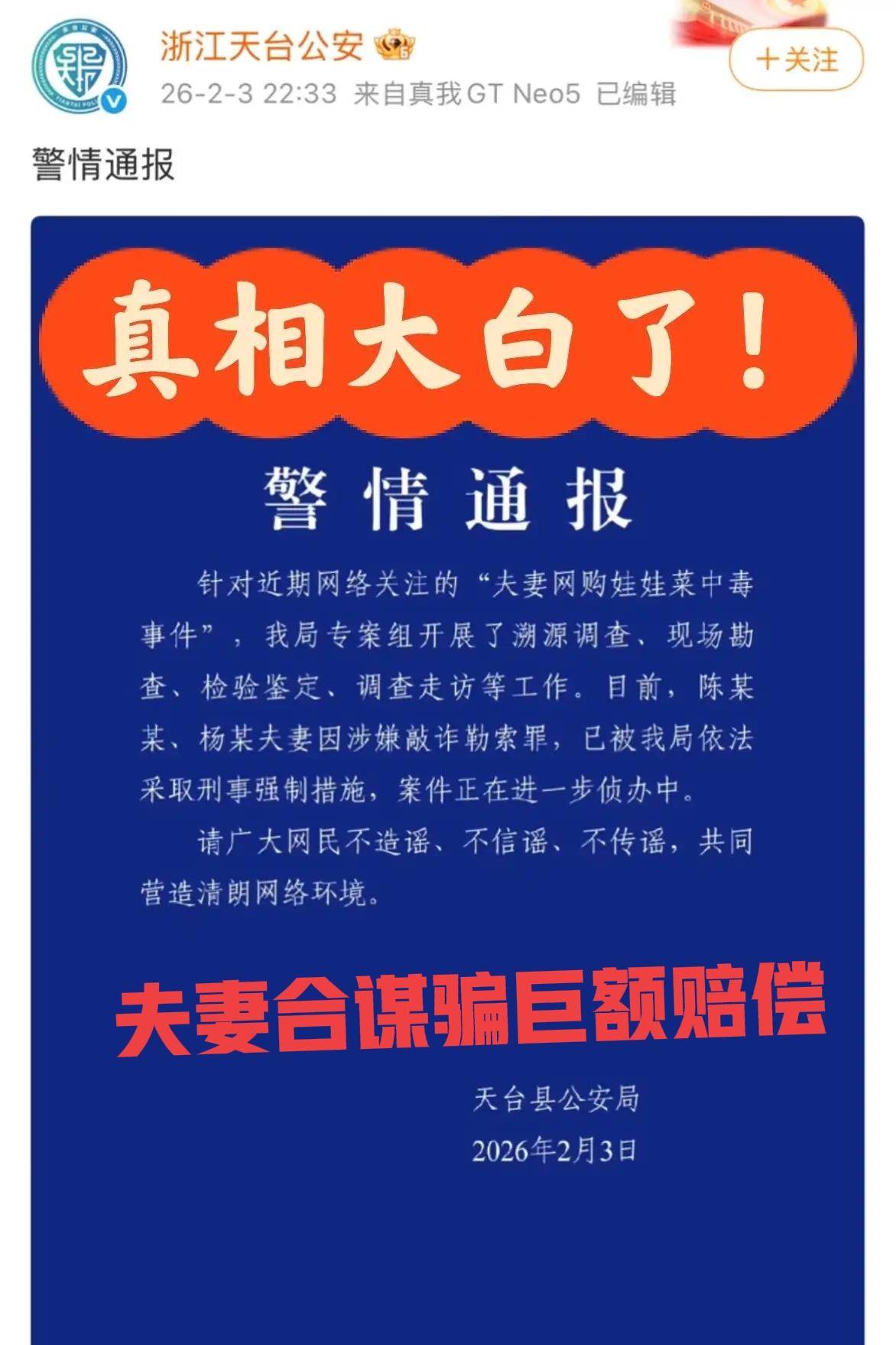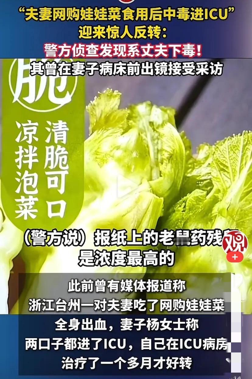 1818黄金眼夫妻网购娃娃菜中毒进入ICU事件,乖乖,谁能想到剧情还能这样反转? 先是嫌疑网购平台, 后又说是丈夫下毒, 如今竟然是夫妻合谋想骗取巨额赔偿款, 说实话丈夫下毒还能理解, 毕竟这几年出了不少相似的事件, 甚至都拍成了电影《消失的她》, 但夫妻合谋以身试毒,以命搏钱, 这么大的不确定风险, 这么大的不确定收益, 毕竟平台面对负面影响和巨额赔偿, 绝对不会坐以待毙的! 所以,真的有人要钱不要命么? 而且还是日子过的好好的俩口子, 难怪网友们都说, 福尔摩斯也猜不到会是这结局…… 也不知道还有没有其他隐情或者反转……