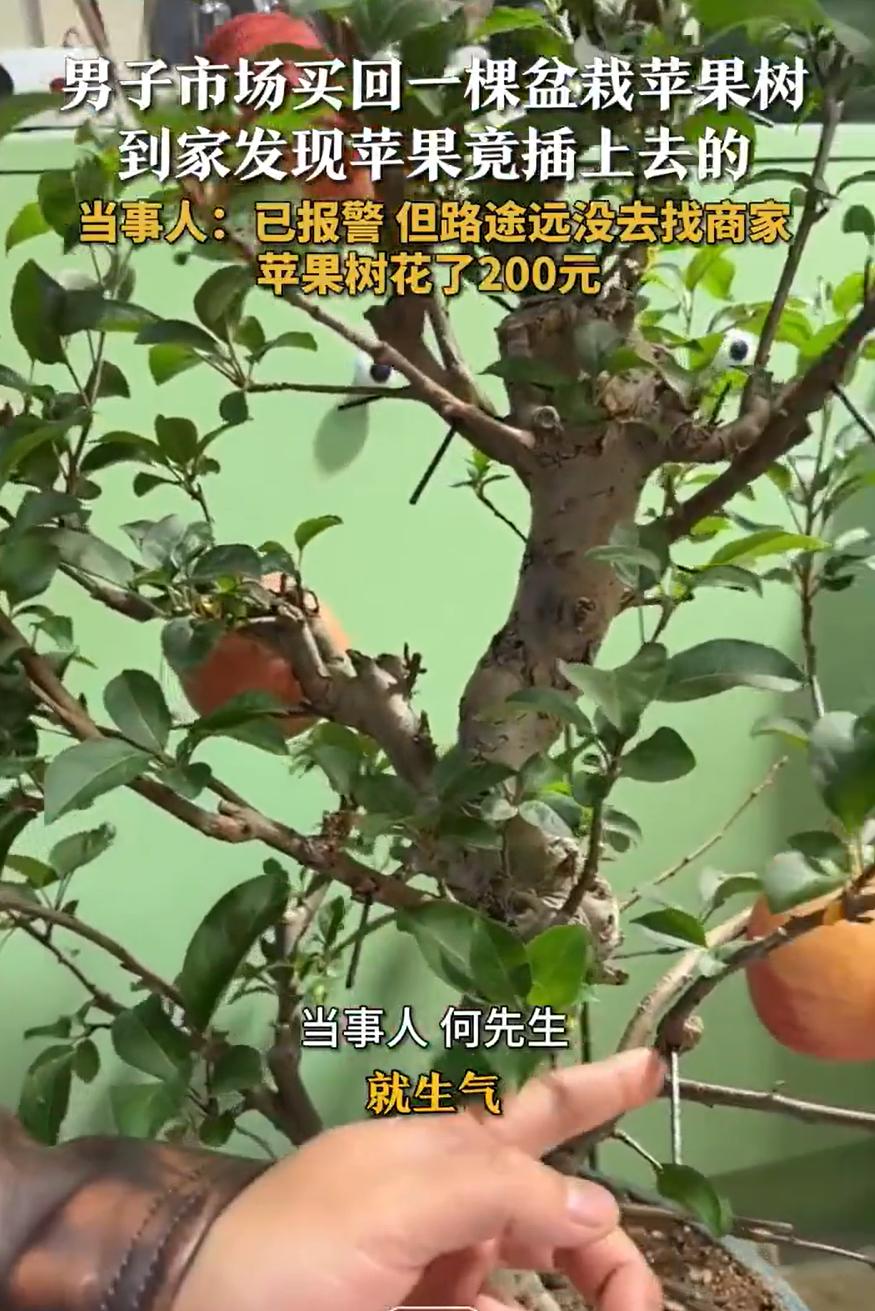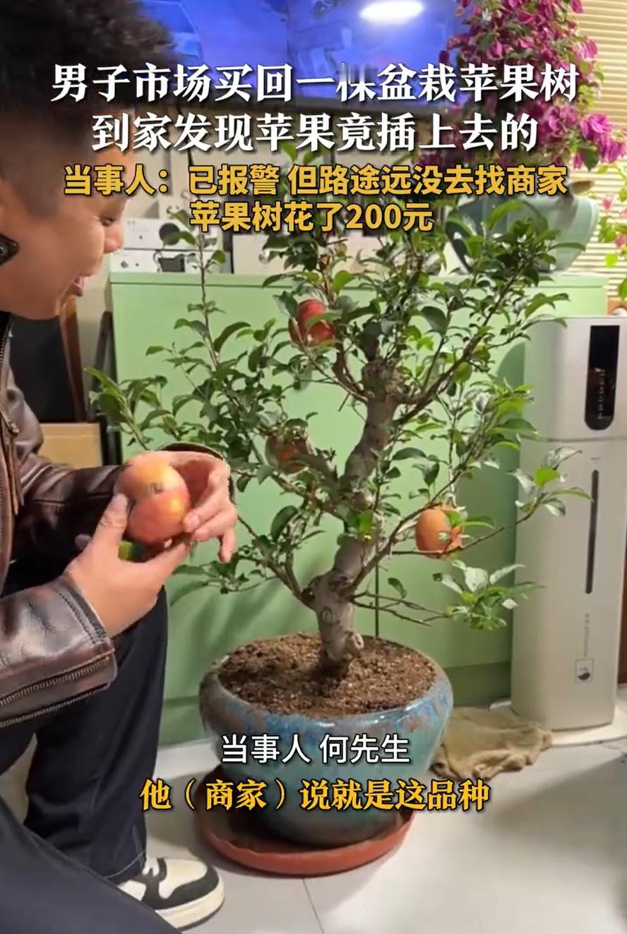 “太坑人了!”天津,一男子逛市场时,看到一盆苹果盆栽不错,就花200块钱买了一盆带回家,可养了几天后,弟弟准备吃一个时,却发现苹果不是长出来的,而是用螺丝拧上去的,男子瞬间意识到自己被骗了 何先生介绍,逛市场的时候,看见一盆苹果盆栽挺稀罕。树不大,果子却结得又大又红,看着就喜人。他心想,这摆在家里多有意思,还能图个“平安结果”的好兆头,没多犹豫,花了二百块钱高高兴兴捧回家了 回家后,他当成个宝贝似的照顾着,浇水看护,没少费心。几天后,他弟弟看着树上的苹果实在诱人,就伸手想摘一个尝尝。结果这一摘,发现不对劲 苹果怎么也拽不下来。再仔细一瞧,好家伙,苹果后面居然藏着一颗小螺丝,硬生生拧在树枝上的! 大哥这才恍然大悟,难怪这么小的树能挂这么大的果,原来全是“手艺”。二百块钱买了个“手工盆景”,心里别提多窝火。他事后报了警,但因为市场离家远,并没有拿着盆栽去找商家理论 有网友说:这算好的了。我以前路边买个仙人球,养三年,有时还浇水,最后无意打翻,才知道是假的 说起来,这种骗术其实不新鲜,但每次有人上当,还是让人觉得又可气又好笑。气的是骗子利用人的喜好和常识盲区,弄虚作假;笑的是这造假的手法,往往直接得有点“笨拙” 可偏偏就是这种一眼假的东西,放在特定的环境里,比如热闹的市场、加上摊主几句“新品种”、“高科技”的忽悠,就很容易让人一时上头,放松了警惕 这些事也给我们提了个醒:遇到反常识的“奇观”,先别急着心动。违反自然规律的东西,多半有猫腻。就像那苹果,正常盆栽果树的果实,大小和形态都会受树体限制,不可能在纤细的枝条上凭空结出硕大完美的果子。买东西,尤其是活物或者植物,多看一眼、多问一句、甚至轻轻摸一摸,都可能避免吃亏