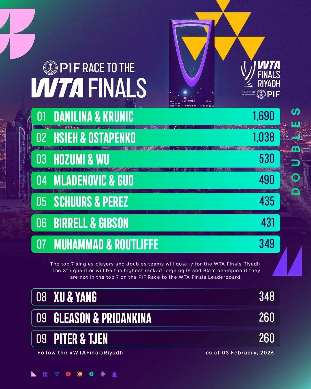 PIF迈向总决赛双打积分榜更新👀*一对组合至少要搭档两站赛事才能上榜利雅得WT