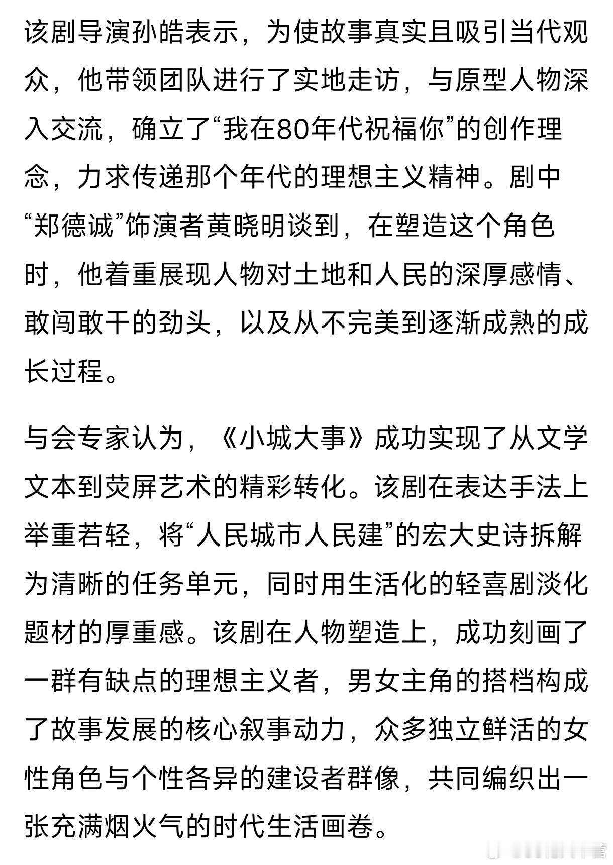 ——《小城大事》成功实现了从文学文本到荧屏艺术的精彩转化。该剧在表达手法上举重若轻,将宏大史诗拆解为清晰的任务单元,同时用生活化的轻喜剧淡化题材的厚重感。该剧在人物塑造上,成功刻画了一群有缺点的理想主义者,男女主角的搭档构成了故事发展的核心叙事动力,众多独立鲜活的女性角色与个性各异的建设者群像,共同编织出一张充满烟火气的时代生活画卷。小城大事赵丽颖李秋萍