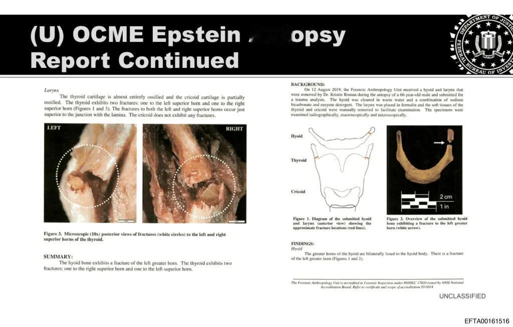 爱泼斯坦自杀后照片首度公开! 此前未曾公开的爱泼斯坦死亡后的遗体照片以及其在狱中的照片,均包含在司法部公布的数百万份新文件之中。 这两份文件——一份是联邦调查局纽约分局的死亡调查报告,另一份是市监狱中心中尉办公室的报告——包含了爱泼斯坦在 2019 年 8 月 10 日凌晨被发现上吊于牢房内的数十张照片。 其中一份报告(司法部将其编号为“EFTA00134598”)显示,爱泼斯坦身着橙色囚服,衬衫被撕开,一名急救人员正试图为其进行心肺复苏术。 埃普斯坦的胸前贴着一些电刺激贴片(这种电刺激贴片常见于心肺复苏急救包中),脖子上戴着颈托,还有一台氧气瓶固定在轮床上,轮床上还有一根通向他嘴部的透明管子。 其中一张照片展示了爱泼斯坦那张极度肿胀、面色惨白的脸,他的脖子上布满了深深的红色伤痕,那是自制的绳索勒进皮肤留下的痕迹。 还有一些照片展示了爱泼斯坦死后其房间的状况,照片中可以看到一条橙色布条还固定在金属床架上,据说他就是用这条布条来吊死自己的。 还有更多的图片显示,埃普斯坦的甲状软骨几乎完全断裂了。 美国司法部大规模公布的这份名为“EFTA00161494”的死亡调查报告,详细记录了这名性侵者的生命最后时刻的情况,同时还配有令人触目惊心的画面。 报告中称,这名被判有罪的性犯罪者在淋浴区拨通了电话,一名警官替他拨通了号码,因为该男子没有设置手机的访问密码和个人识别码。 随后,那位警官将爱泼斯坦留给了另外两名警员,而这两名警员当时正在执行加班任务,直到 8 月 10 日早上才结束工作。 当天早上 6 点 33 分,警报系统响起,正在值班的中尉接到警员通知说:“爱泼斯坦自杀身亡。” “我们没有完成凌晨 3 点和 5 点的查房工作。”第二名警员说道,而第三名警员则说:“我们搞砸了。”随后他纠正自己说:“是我搞砸了,她没有责任,我们根本就没有进行查房。” 爱泼斯坦被转移到了二楼的医疗区域,一名护士随后进行了心肺复苏术,此前那位中尉已经实施过心肺复苏,但仍未检测到脉搏。