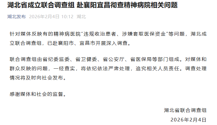 湖北省成立联合调查组,已赴襄阳市、宜昌市就媒体反映有的精神病医院“违规收治患者、涉嫌套取医保资金”等问题开展深入调查。
