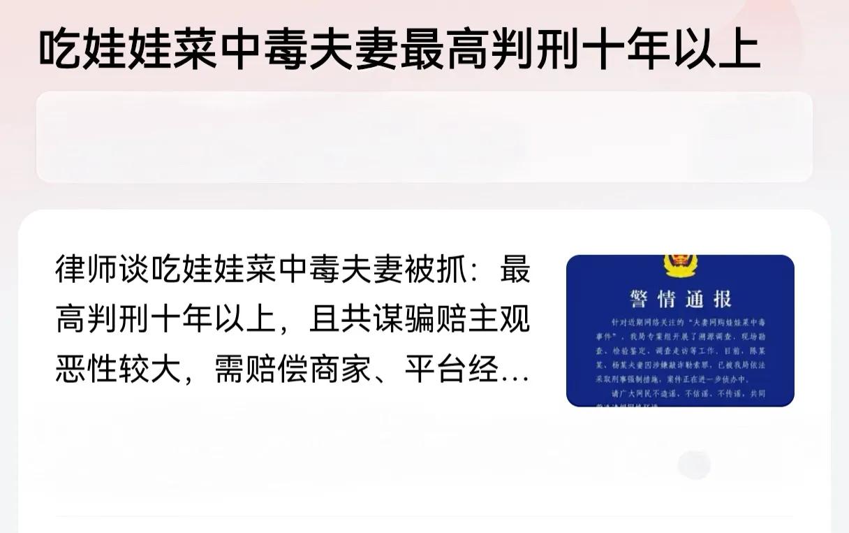 是正经律师吗?靠谱吗?说娃娃菜中毒夫妻最高判刑十年以上,和掏鸟大学生一个级别了,这两个戏精属于是犯罪未遂吧,光速破案,他们都没来得及实施犯罪吧!希望真如律师所说真的能够判他们10年以上,那是极好的事情,能起到很好的警示作用,大快人心,狠狠打击恶意碰瓷的歪风邪气!