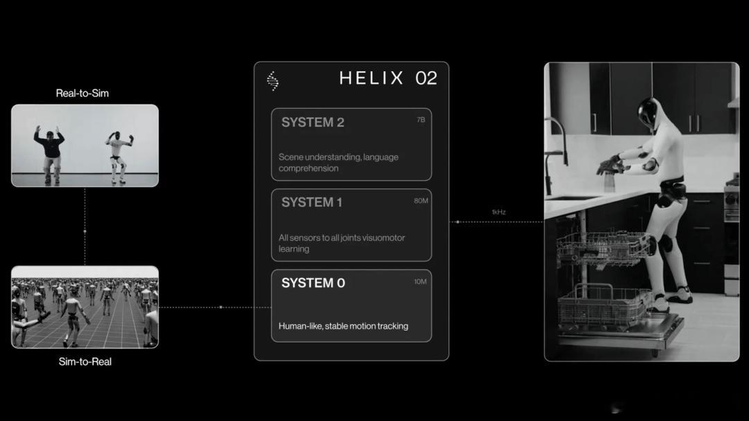 Figure 机器人持续在 “大脑” 层面突破,新模型 Helix 02 靠单一神经网络实现全身长程自主控制。机器人能在厨房连续完成数分钟复杂任务,还能像人一样用臀部关抽屉、用脚辅助操作。