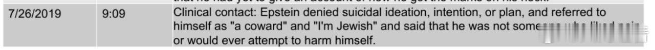 临床记录显示爱泼斯坦否认有自杀倾向——文件记录显示他自称是“个懦夫”