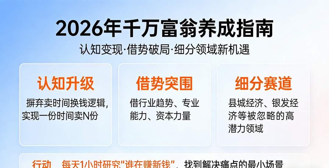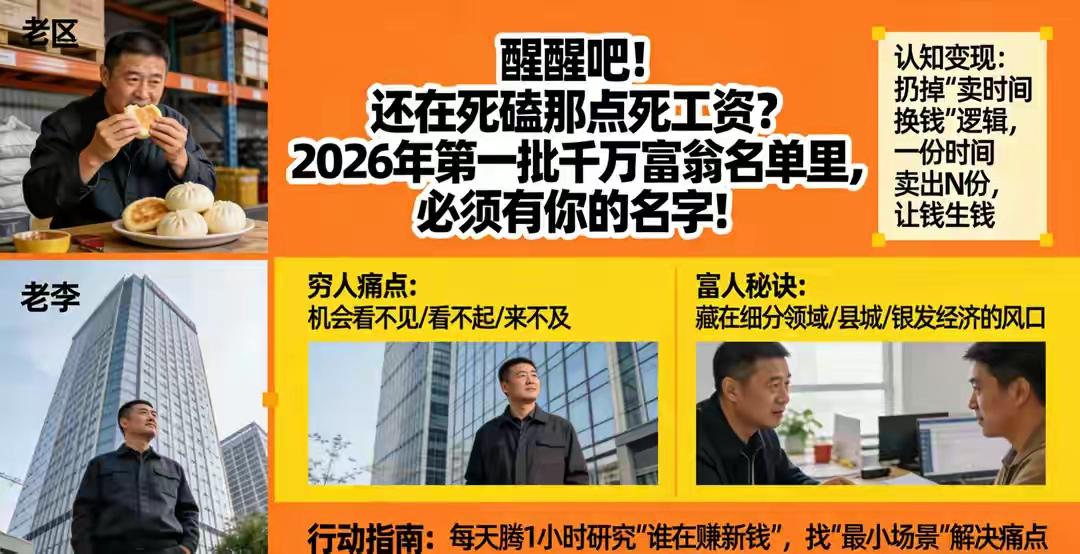 别光在工厂里挣那点死工资了!2026年第一批千万富翁就藏在这三个被嫌弃的赛道里,现在上车还来得及! 你发现没有,那些真正赚到大钱的人,好像突然就冒出来了。就像你楼下的老张,去年还在为外卖超时费纠结,今年居然悄无声息地盘下了一个社区食堂。不是他中了彩票,而是他看懂了政策文件里“一刻钟便民生活圈”那几个字背后,藏着普通人最实在的吃饭生意。 财富的转移,从来不是敲锣打鼓。它静悄悄地从那些被唱衰的行业流出,注入到那些被多数人忽视甚至看不起的角落。当所有人挤破头冲进人工智能时,智慧的眼光早已投向了为这些AI大模型提供精准数据清洗的“数字蓝领”培训。风口,往往穿着不起眼的外衣。 为什么你总觉得机会是别人的?因为你的注意力太贵了,贵到只愿意分配给热搜上的喧嚣。而真相是,最大的金矿可能在隔壁县城那个废弃的厂区里,被改造成了冷链物流中心;也可能在为你父母设计一款字体超大、操作极简的智能药盒里。银发经济的浪潮,扑打得比想象中更猛烈。 别再迷信“一份时间换一份钱”的古老等式。这个时代的财富密码,在于你能否将一份时间酿成可以多次售卖的“产品”。它可能是一套你深耕行业的线上实操课,也可能是一个解决了特定人群痛点的订阅式服务。你的时间,值得更昂贵的标价。 “借力”是跨越阶层的终极智慧。单打独斗的英雄时代早已落幕。你需要敏锐地借政策的东风,诚恳地借专业人才的大脑,稳健地借金融的杠杆。把自己活成一个开放的平台,让资源如水般流动汇聚。诚信,是你最硬的通货。 从今晚开始,请务必偷出一小时,屏蔽所有噪音。认真思考:哪些需求正在疯狂增长,而供给却还粗糙不堪?那个让你家人、朋友频频抱怨的“不方便”,是不是正孕育着一个商业的雏形?最小的痛点,往往连着最广阔的市场。 富翁从来不是“变成”的,而是“长成”的。当你终于切换了思维频道,步履坚定地走在符合趋势的路径上时,财富便会如影随形。2026年的榜单,此刻正在被书写。改变的钥匙,不在别处,就在你决定转动的那个瞬间。 (来源: 网络博主) 财富风口 认知破局
