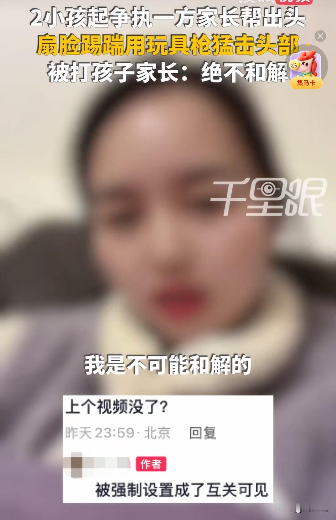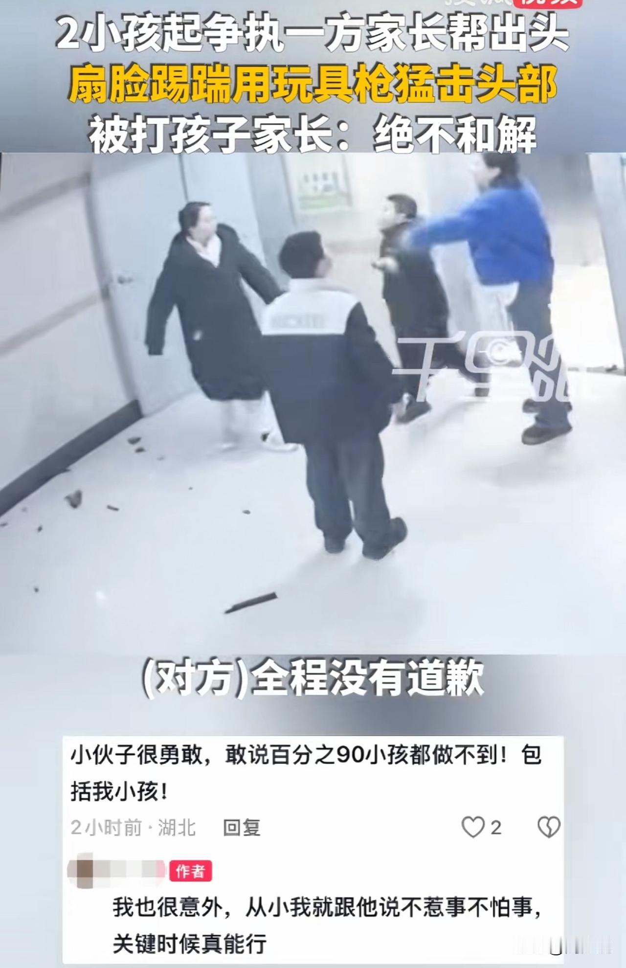 “气愤!”看到一个新闻,湖北仙桃这事儿太离谱了!俩小孩楼下玩闹起争执,一方家长竟冲下楼,对着别人家男孩扇脸、踹肚子,还用玩具枪猛击孩子头部。被打孩子家长调监控才发现,这哪是劝架,分明是下死手!如今孩子留院观察,打人家长没一句道歉,受害方直言:绝不和解! 这事一出,网友炸开了锅。有人怒喷:“大人跟小孩计较,算什么本事”。 也有人叹气:“俩孩子的小摩擦,本可以好好沟通,这下闹大了”。 这事看下来,周少认为家长护娃的心能理解,但用暴力泄愤,实在拎不清。孩子间的矛盾,本该是他们学习处理冲突的契机,家长贸然插手,还诉诸拳脚,不仅会给被打孩子留下心理阴影,也会给自己的娃树立糟糕的榜样。 遇事就动手的教育方式,或许会让孩子误以为暴力能解决一切。物业也说了,小孩闹矛盾找家长沟通就好,动手肯定说不过去。 静待警方依法处理,也希望所有家长都能明白:护娃的底线,是守住法律和教养的边界。#寻美三湘# #长沙新朋友#