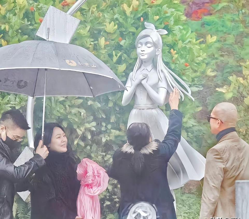 雨很大。 他用一把黑伞的伞尖,勾下了那块布。 布滑落。 露出的不是徐熙媛。 是一个闭着眼微笑的小女孩。 金宝山墓园,大S逝世一周年。 具俊晔亲手做的雕像,揭幕了。 到场的人很多,小S,蔡康永,言承旭,周渝民。 都在雨里站着。 现场炸了。 这根本不是她。 既不形似,也不神似。 一个廉价的卡通摆件。 有人在窃窃私语。 具俊晔解释了。 他说,这是他心里熙媛永远的样子。 灵感是她自称的“外星人”。 所以底座是9个行星方块,“9”在韩语里,和他同音。 雕像的手背上,刻着她的翅膀纹身。 碑文上,是他的皇冠纹身。 不锈钢和黄铜,3米多高,面朝台北。 听起来很深情。 但那个动作。 用伞尖去揭幕。 像挑开一件无关紧要的东西。 太轻佻了,太草率了。 小S在现场哭喊“珊,好想你哦! ”,下一秒又讲起了地狱笑话。 她妈妈黄春梅倒是很满意,和女婿紧紧拥抱。 孩子们没来。 有人说,看到具俊晔在雨里对着雕像下跪,是个表演型疯子。 也有人说,能花一年时间,把两人之间的密码、纹身、昵称全都铸进金属里,这爱已经不是给外人看的了。 一个男人,用宇宙级的浪漫去构思,却用菜市场般的草率去执行。 这到底是深情到了极致的笨拙,还是根本无所谓的作秀? 可能我们永远分不清了。 就像我们也分不清,小S的眼泪和笑话,哪个才是真的。