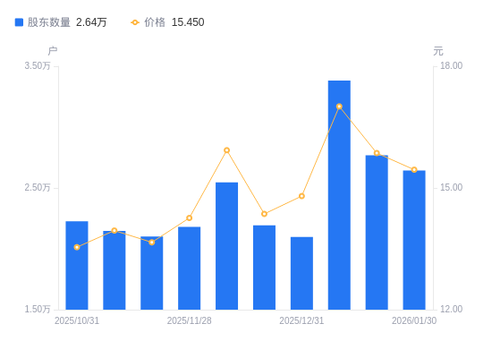 日期A股户数(户)流通A股户均持股数(股)户均持股市值(万元)2026-01-30264407239.4111.182026-01-20276866913.6010.962026-01-09338175660.179.632025-12-31209679129.1013.512025-12-19219268729.8112.542025-12-10254677516.0011.972025-11-28217968781.8812.522025-11-20210129109.5512.442025-11-10214728914.3912.442025-10-31222618598.4411.64