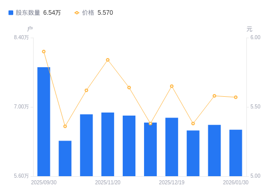 日期A股户数(户)流通A股户均持股数(股)户均持股市值(万元)2026-01-306538815034.048.372026-01-206636814812.058.272025-12-316523815068.618.112025-12-196780614497.928.192025-12-106683814707.897.912025-11-286824014405.728.122025-11-206887714272.498.342025-11-106850414350.208.062025-10-316315215566.358.342025-09-307804212596.377.43