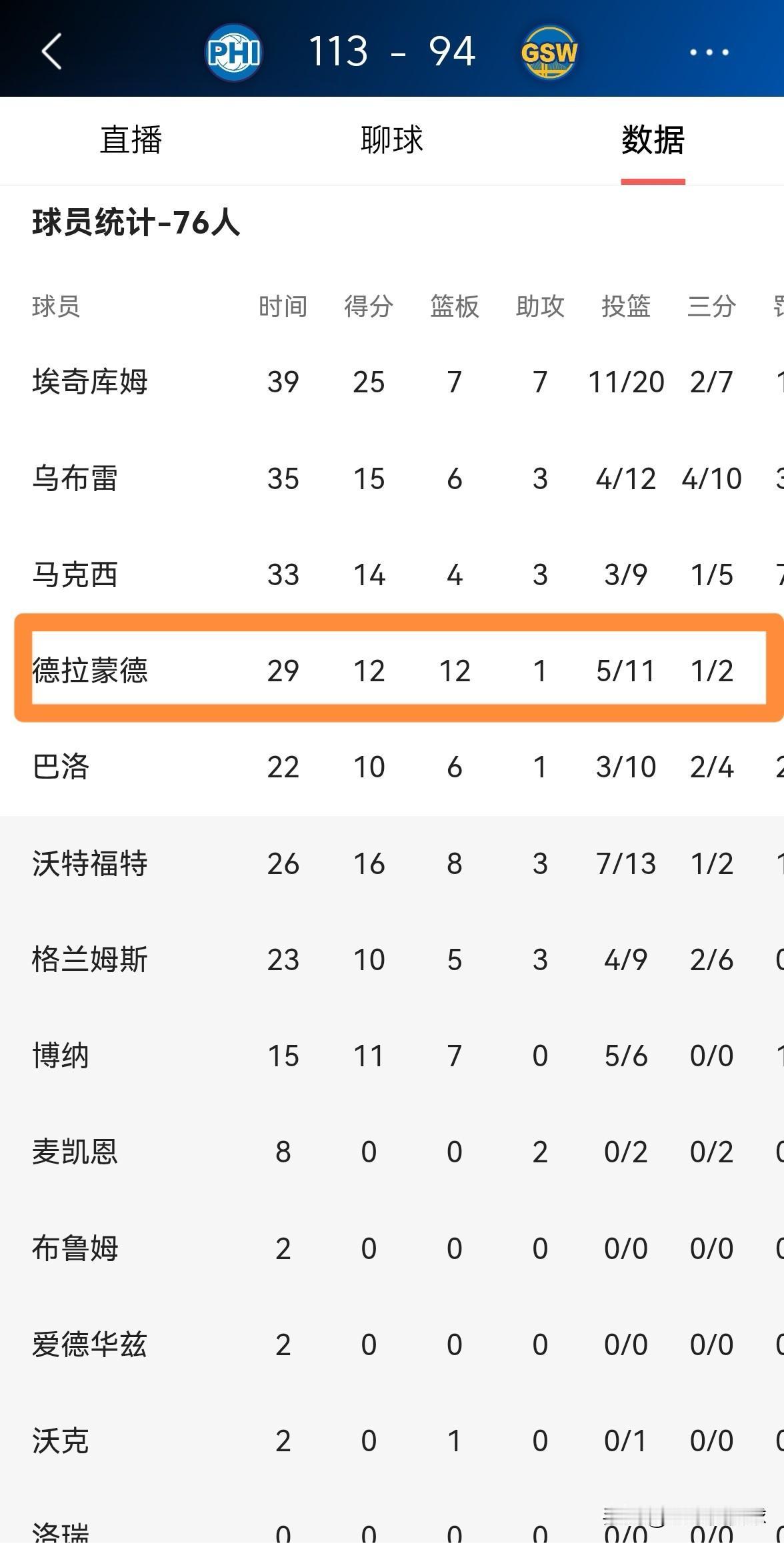 我忍不住要怒赞76人老将德拉蒙德!在今天76人客场以113:94大胜勇士的比赛中,德拉蒙德在攻防两端都打出了非常精彩的表现,为球队的赢球提供了非常大的帮助。 全场比赛下来,德拉蒙德首发出战29分钟,投篮11中5,其中三分球2中1、罚球2中1得到12分12篮板1助攻1抢断1盖帽,其中包括6个前场篮板,他的场上正负值为+7。
