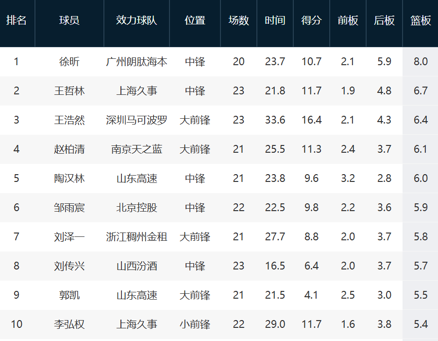 据数据统计,第一阶段本土球员场均篮板榜已经出炉,其中徐昕以场均8.0篮板高居第一,王哲林和王浩然分别以6.7篮板、6.4篮板位列二、三位。