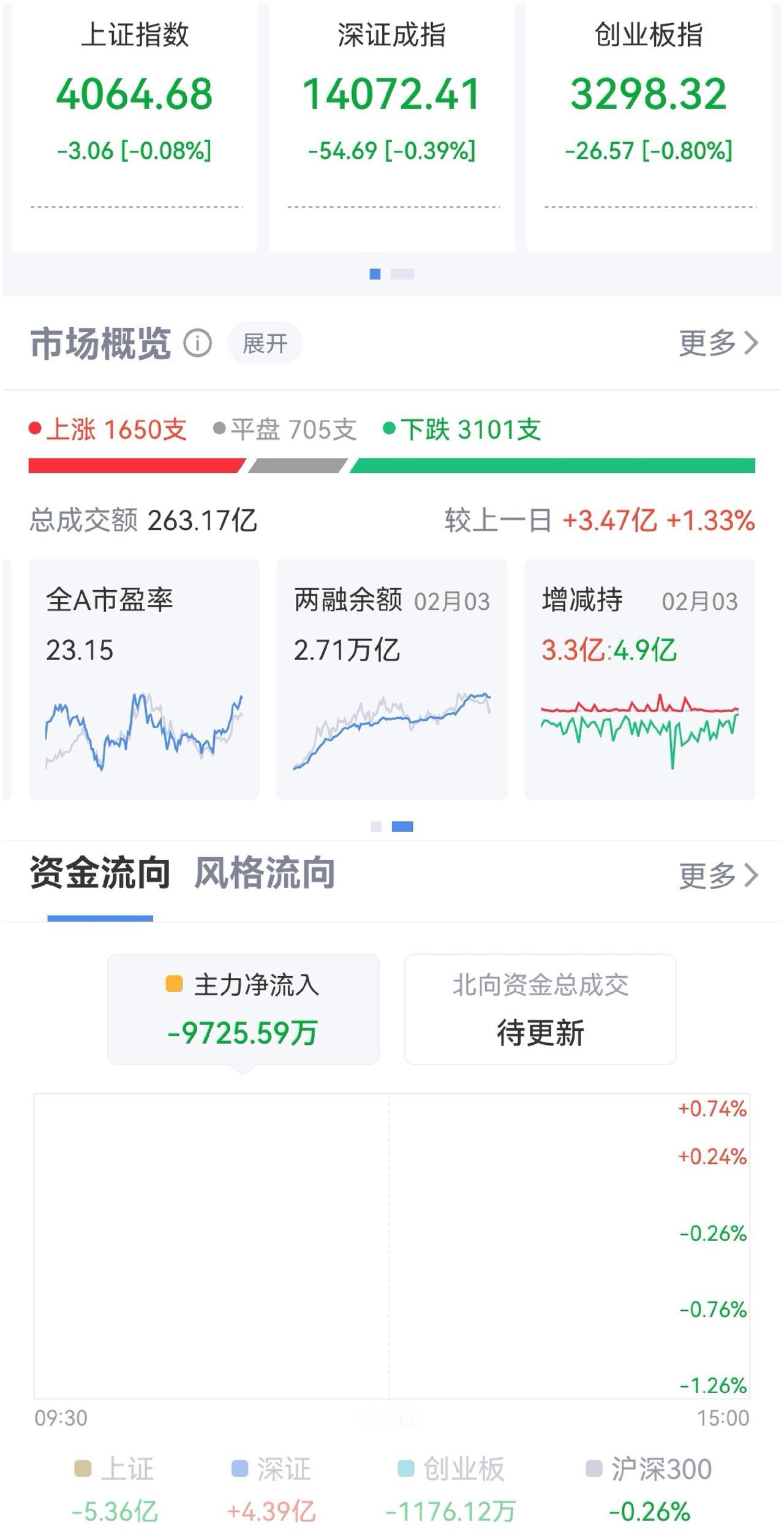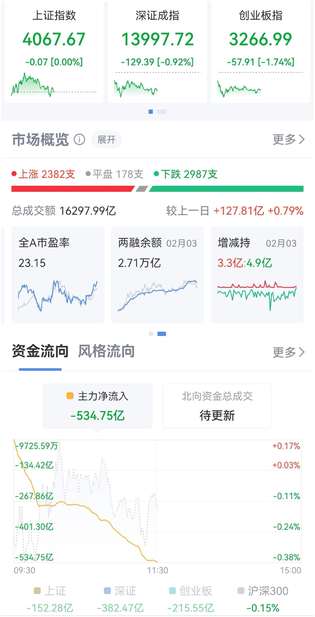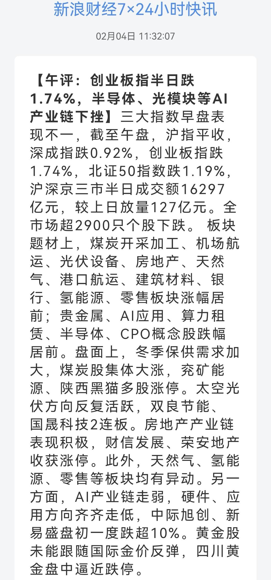 午盘印象(2月4日) AI相关极弱 调整又起 外围:美股分化 英伟达连续弱势 科技承压 内股:AI带翻科技 量能不济 连续反弹无果 一、三大股指开跌: 指数开盘弱势 个股开盘涨平跌比率30%:13%:57%。 个股开盘弱势(-27 Vs +81个百分点), 昨日反弹,早盘无力, 二、早盘指数分化 反攻无果 沪市冲高回落 深市跳水震荡 半日1.61万亿,量能低位 三、涨跌幅榜: AI压制科技 红利护盘 跌幅前列:AI应用和硬件、贵金属、航天 涨幅前列:煤炭、地产产业链、大金融 四、开盘和午盘: 开盘:沪-0.08%、深-0.39%、创-0.80%。 午盘:沪-0.00%、深-0.92%、创-1.74%。 科技因英伟达弱势承压,市场回落,宽基ETF休息中 五、午盘个股上涨43%,与昨日涨跌差距(-11 Vs +64个百分点),个股大幅走弱 相比开盘,涨跌差稍减,上涨个股略减 净流入-535 ( +0 )亿,资金恶化大幅净流出 六、沪深两市成交量午盘16,157亿,上个交易日16,040亿,同比量能扩张100亿,量能不济,冲高回落或跳水低走震荡。 七、指数反弹无力,量能制约又走低 融资额前日降-60亿、昨日-28亿,降杠杆成效显著。市场情绪低落,量能如不能补充,难免下跌中继 午后两种情形: 1、横盘震荡:AI压制科技,时间换空间,震荡消化获利盘。 2、震荡下跌:科技熄火,大起大落,慢牛格局未变。 (图片源自网络侵权告知删除)