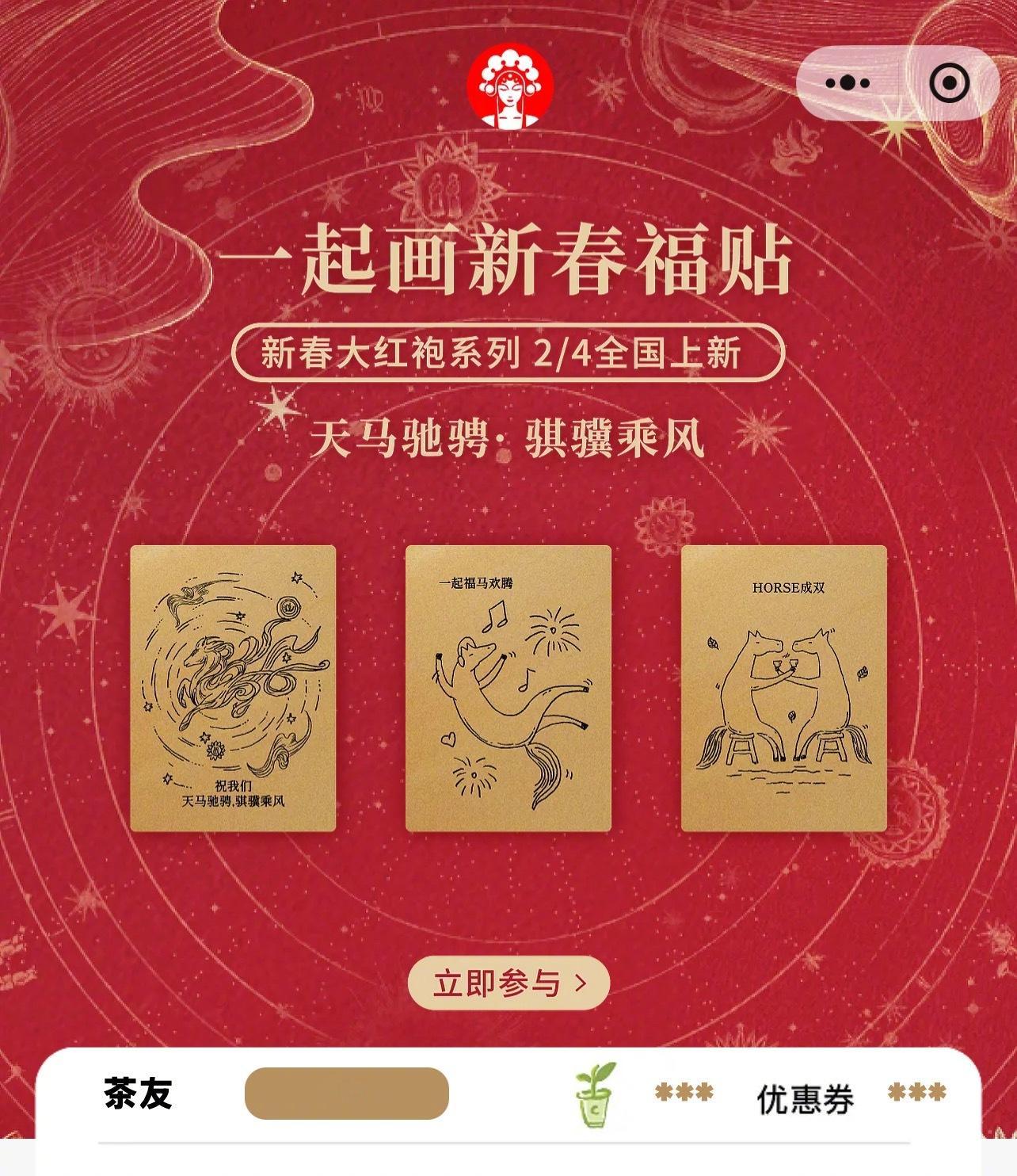 霸王茶姬福贴放自己一马,发现了吗?霸王茶姬今天上新品了,而且还换上了「天马驰骋」主题杯,设计很新春🍃,很有“年”味儿🧨。有意思的是在他家小程序里还出现了“福贴”玩法,就是你可以自己DIY杯贴,把想说的新年祝福、情绪和小愿望全都自己画上去,打造一个独一无二的“福贴”。挺有趣,解压又上头,拥有马良画笔🖌️风采的你,一定要去试试!霸王茶姬天马驰骋 骐骥乘风