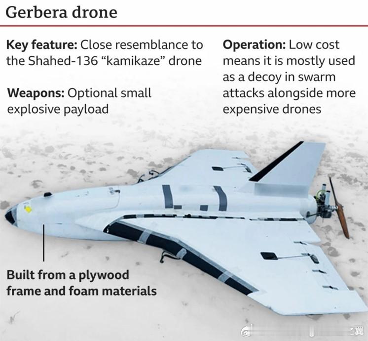 “非洲菊”无人机由胶合板和泡沫塑料制成,旨在模仿更昂贵的“见证者-136”。最初主要用于充当诱饵以消耗乌方防空导弹,或作为信号中继和电子侦察平台。