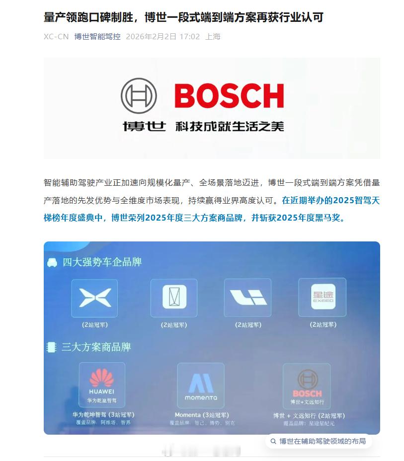 感谢博世对我们这次活动的报道,也特别感谢博世智能驾控中国区副总裁陈大宇先生在活动当天的精彩演讲,让大家都更了解博世的智能驾驶技术,今年的智驾大赛期待博世有更多的量产车型加入,获得更多的好成绩!