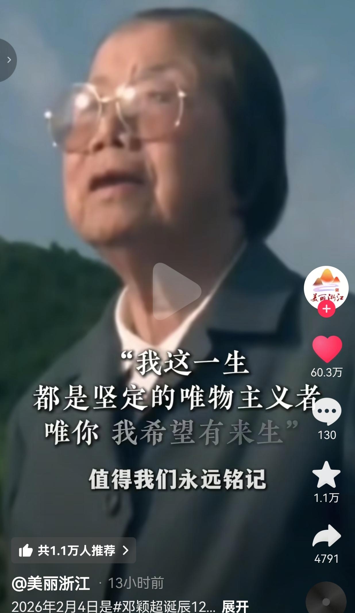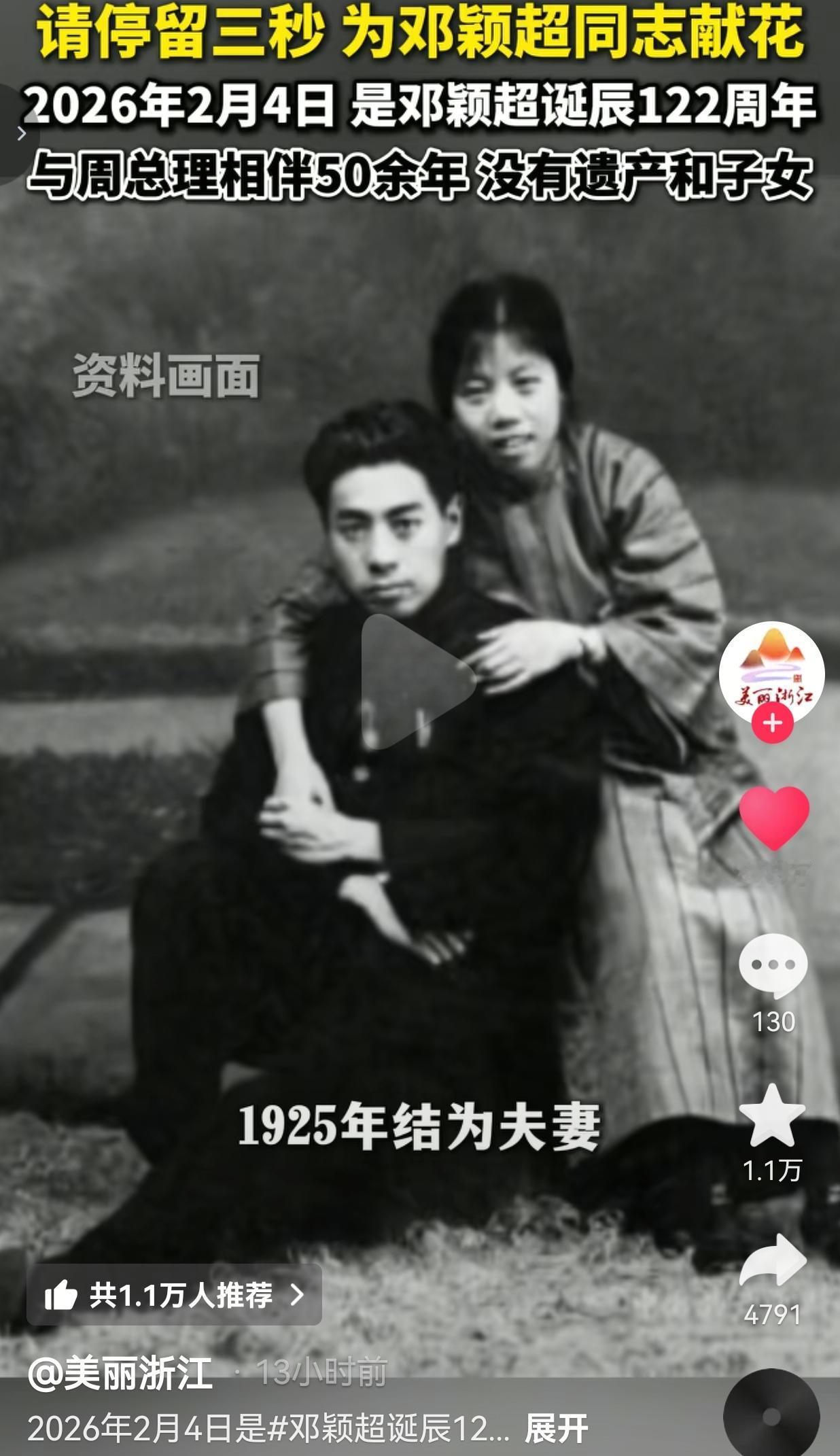 请您停留三秒,为这位伟大的女性,邓颖超同志献上一束鲜花! 今天是2026年2月4日,是邓颖超同志诞辰122周年。她和周总理从1925年结为夫妻,相伴走过50多年风雨,他们没有盛大的婚礼,也没有留下一儿半女,甚至没有给后人留下一分钱遗产,却把最滚烫的爱,全部给了这片土地和人民。 视频里,邓颖超与周总理合影的黑白老照片,年轻时的周总理温文尔雅,邓颖超温婉坚韧,两个人眼里都是对彼此的笃定和对家国的热忱。 他们的爱情,不是花前月下的浪漫,而是“为中华之崛起而读书”的志同道合。 在那个战火纷飞的年代,他们时常分离两地,甚至面临生离死别,却常在通信中告白。 周总理曾在信里写道“望你珍摄,吻你万千”,邓颖超回他“情长纸短,还吻你万千”。这些跨越时空的情话,藏着最动人的默契。 唯一遗憾的是,他们的孩子不幸夭折后,邓颖超把对小家的遗憾,变成了对大家的大爱。 她曾说:“我们之间,是战友,是同志,是爱人。” 1992年邓颖超离世时,特意嘱咐要用周总理的骨灰盒盛放自己,最终一同撒向他们相识相恋的海河。 这对革命伴侣,以最深情的方式完成了重逢。就像她曾说的:“我这一生都是坚定的唯物主义者,唯你,我希望有来生。” 她走的时候,除了几件旧衣服和一箱子书,什么都没留下。可在人民心里,她留下了一座永远的丰碑。 她没有子女,却成了无数青年的“邓妈妈”;她没有遗产,却让“为人民服务”这五个字,刻进了每个中国人的血脉里。 邓颖超用一生告诉我们:一个人活在世上,最有意义的事,是被别人需要,是给这个世界留下点什么。所以说,当我们抱怨生活不易时,不妨想想,正是因为有无数像她这样的先辈,用一生的付出换来了我们今天的安稳。 今天,让我们缅怀这位伟大的女性!缅怀她的丰功伟绩!