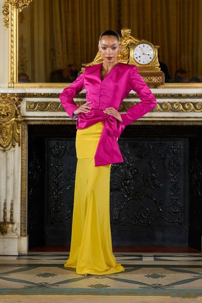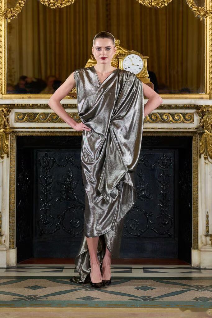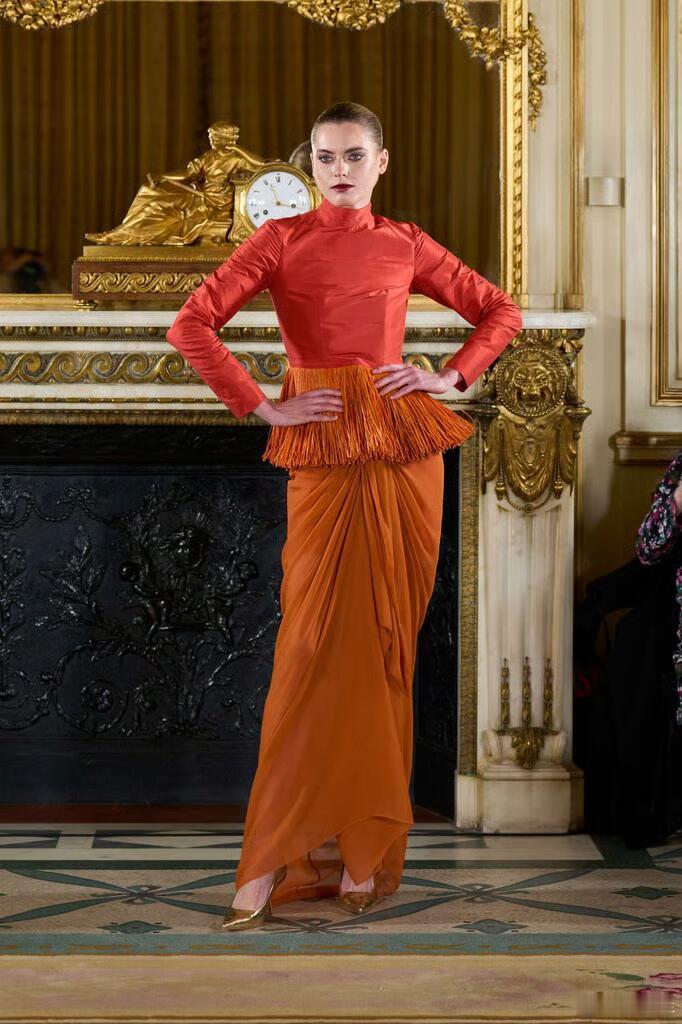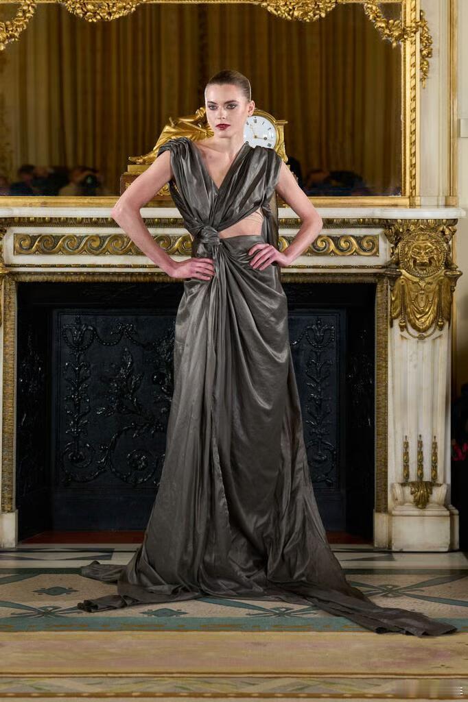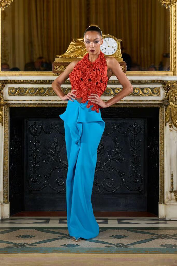本季作品大量采用垂坠结构、手工打结与缠绕技法,材质上融合挺括丝绸与高饱和度宝石色系,细节处缀以拉菲草流苏;斜裁剪裁贯穿全场,赋予廓形流动感与建筑感并存的视觉张力。巴黎高定时装周大秀直击