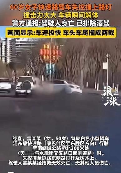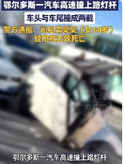 太惨了!车头车尾撞成两截!鄂尔多斯快速路车祸,轿车撞灯杆断两截,60岁女司机抢救无效离世 2月2日上午10时17分,内蒙古鄂尔多斯市东胜区东康快速路,一场突如其来的惨烈车祸,打破了道路的平静,也让一个家庭陷入永恒的悲痛。 据网友行车记录仪及现场画面显示,60岁女司机雷某某驾驶白色小型轿车,沿东康快速路从康巴什区驶往东胜区方向,行至南绕城公路桥北300米处(天骄路与水岸街交叉口南侧)时,车辆突发失控,径直冲向道路东侧的路灯杆及行道树,撞击瞬间发出巨响,路灯杆被当场撞塌,轿车更是因巨大冲击力直接断裂,车头与车尾彻底分家,车身严重变形解体,零部件散落一地,现场触目惊心。 事发后,交警、消防及120急救人员第一时间赶赴现场处置,全力对驾驶人雷某某展开救援,奈何其伤势过重,经抢救无效不幸身亡,万幸事故未造成其他人员伤亡。周围目击者回忆,事发时能清晰听到撞击声,轿车失控前无明显减速迹象,车身断裂后的残骸几乎难以辨认原本轮廓,让人不忍直视。 2月3日,鄂尔多斯市公安局交通管理支队发布官方通报,称经专业检验鉴定,已排除雷某某酒驾嫌疑;目前事故具体原因正在进一步调查,后续将依法公布调查结果。 一场车祸,两截车身,一条逝去的生命,临近年关这场车祸让人看了既揪心又惋惜!这一事件更警醒我们,车速是安全的第一道防线,宁慢三分,不抢一秒。不管什么原因,什么时候,都要切记慢行,十次事故九次快,永远是不变的真理。 年关将至,马上全国各地就有很多的游子踏上归乡的旅程。公路上的车流量日益增大,每一条道路都承载着人们对家的期盼和团圆的渴望。回家过年,本是一年中最温馨的时刻,可如果因为一时的疏忽,就可能让这份喜悦变成悲剧。每一位驾驶者都肩负着自己和他人的生命安全,一定要时刻保持高度的警觉。在出行前,仔细检查车辆状况,确保刹车、轮胎等关键部位没有问题;行驶过程中,严格遵守交通规则,不超速、不疲劳驾驶、不随意变道。 此外,年关期间,大家可能会因为忙碌而身心疲惫,这时候更要注意休息,调整好自己的状态再上路。不要因为归心似箭,就忽视了交通安全。我们要把平安带回家,这才是对家人最好的礼物。希望每一个在路上的人,都能平平安安,顺利与家人团聚,度过一个欢乐祥和的春节。