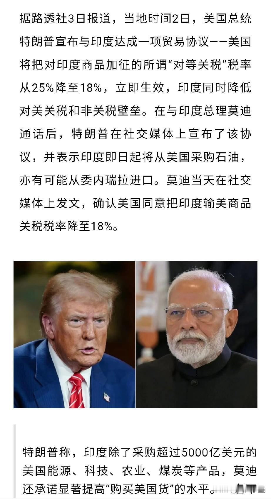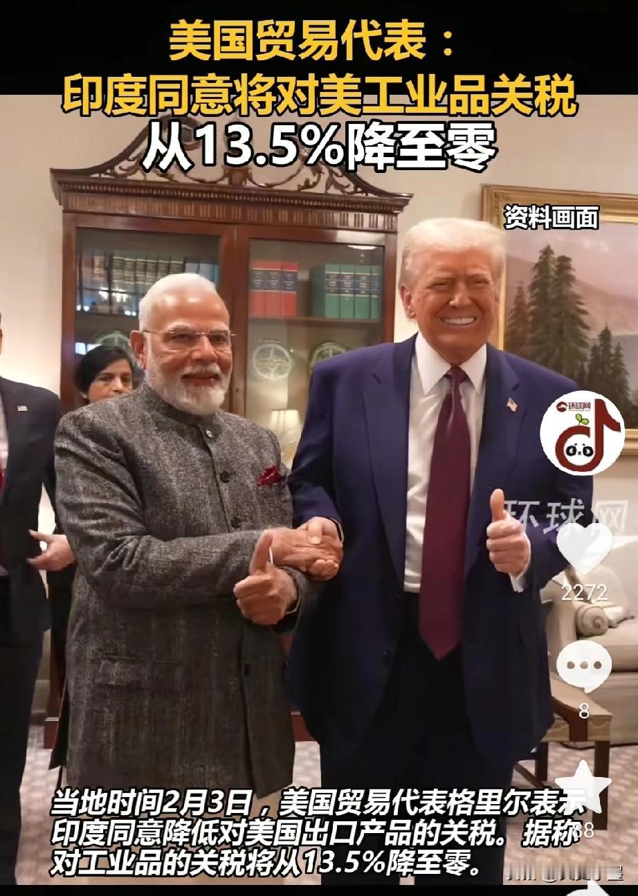莫迪这通发自肺腑的感谢估计把特朗普都整不好意思了吧! 这件事怎么来看呢,简单点说就像商家卖一件商品一样,正常市场价是100,搞活动前先涨价到200,看你是熟客,给你打8折卖你160一样,明面上让顾客以为赚了便宜,实际上商家挣得更多了! 当然,美国降低关税的主要条件就是让印度停止购买俄罗斯石油,转而大量采购美国的石油,同时还附加采购一些飞机大炮啥的武器装备! 美国对印度产品关税只是降低到了18%,而印度对美国工业产品关税则是将最终降低到0。 是吃亏还是赚便宜,这一点莫迪自然能够看清,但是他好像因为一些原因,不得不去满足美国提出的要求,不然谁会接受这样的条款!