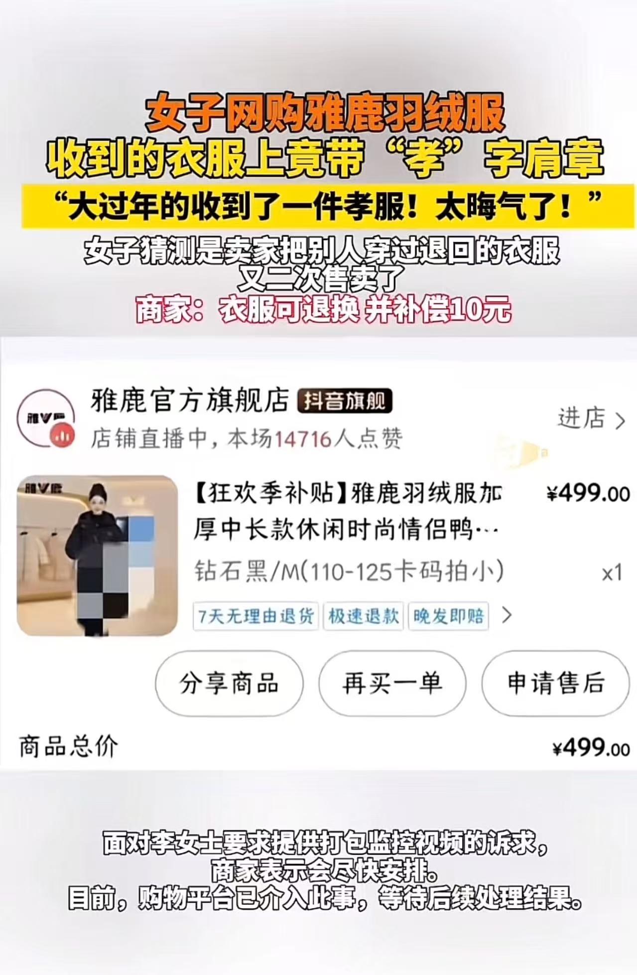 “太晦气了!”吉林,女子网购羽绒服,收到的衣服上竟带“孝”字肩章!女子猜测是卖家把别人穿过退回的衣服卖给了自己,她要求商家赔偿道歉,但商家表示只能补偿10元! 2月3日,吉林长春的李女士在社交平台怒发视频,控诉自己网购的一件黑色羽绒服竟缝着一枚刺眼的白色“孝”字臂章,瞬间让她从期待新衣的喜悦跌入“触霉头”的愤怒深渊。 李女士为过年添置新衣,在某电商平台下单了一件标价499元的加厚长款羽绒服。 收到包裹后,她满心欢喜地拆开,却在抖开衣服的一刹那浑身一僵——右肩位置赫然别着一个约5厘米宽的塑料臂章,白底黑字,“孝”字格外醒目。 “我当场头皮发麻!”李女士回忆,“大过年的,谁家愿意穿带‘孝’字的衣服?太晦气了!” 她合理怀疑:这是某位买家曾穿着参加丧事,退货后商家未彻底清洁复检,直接二次上架销售。 李女士联系客服,对方起初轻描淡写:“可能是打包时混进来的,我们补偿您10块钱吧。” 李女士震惊:“10块钱就想打发我?这是钱的问题吗?这是精神上的冒犯!” 随后,客服又改口否认:“我们发货前都有严格质检,不可能有贴花。” 可当李女士要求提供打包监控视频以证清白时,对方却含糊其辞,只说“会尽快安排”。 目前,平台已介入调查,但李女士的年味,早已被这件“阴间穿搭”搅得荡然无存。 此事迅速引爆网络:“昨天婚礼跟妆,新娘两个妹妹穿的灰色羊绒大衣吊牌都没拆!她们亲口说:‘穿完就退,省几百块。’我当场石化!” “七天无理由退货本是保护消费者,现在却成了某些人‘免费穿用’的漏洞!试穿可以,穿去办事再退,就是占便宜!” “建议平台推行‘24小时无理由退换’——足够试穿、拍照、判断是否合适。超过24小时,除非质量问题,否则不得退货。否则,诚信消费者的权益,正在为‘薅羊毛党’买单。” 我想说的是,一件带“孝”字的羽绒服,照见的不只是商家的疏忽,更是“七天无理由退货”制度被滥用后的系统性溃烂。 当“无理由退货”异化为“免费试用+场景消费”,当丧服、婚服、面试装都能“穿完即退”,那么每一个收到“全新商品”的你,都可能正穿着别人的人生碎片—— 或许是葬礼的哀伤,或许是婚礼的喧嚣,甚至是医院的消毒水味。 而商家为了压缩成本,对退货商品仅做表面翻新便重新上架,把“库存周转率”置于“消费者尊严”之上, 最终让李女士们在新春佳节,被迫穿上别人的“晦气”。 真正的消费者保护,不该是纵容“想穿就穿”,而应建立退货商品分级处理机制:严禁将高敏感度使用痕迹的商品重新流入普通销售渠道;平台应对“高频退货用户”进行信用评估,防止制度被恶意利用。 购物不是开盲盒,新衣不该有前任。别让“无理由退货”,成了“无底线伤害”。