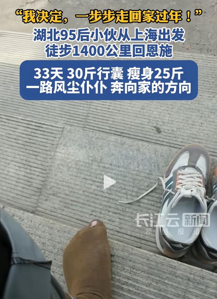 要健康还是要对自己狠下心! 湖北一位小伙,为了降血脂,控制好反复的胰腺炎,决定过年徒步1400公里回老家湖北,每天一顿饭,走坏两双鞋,现在身体各项指标均正常。 现在许多年轻人已经亚健康,湖北这位95后小伙也不例外,由于工作繁忙,小伙一直都不运动,久坐和奶茶成为日常。 久而久之,小伙因为急性胰腺炎反复住院,药物控制了一时,控制不了长时间,反复的住院不仅耽误了时间,还影响到了健康,小伙意识到自己才30岁,每天看着自己血脂数值都感到焦虑,远在湖北的父母隔着手机屏幕也为他担心。 小伙越想越觉得这样下去不行,自己才30岁,还有很长的路要走,连父母的身子都比他好,加上现在临近春节,回老家还不是每天吃喝玩乐,于是小伙把心一横,做了个大胆的决定。 他决定用1400公里回家的路,来换自己的健康,这个决定并不是一时头脑发热,不仅仅可以挽回自己的健康,而且长时间的工作也让他想出去走走,哪怕在山间田野上漫步也好。 于是小伙在开年的1月1日开始,把自己的年假什么的都用上,提早进行他的血脂大作战。 小伙不仅每天要走30多公里,更要命的是还背着30斤的行李,起初的十天是他最崩溃的时间,长时间不运动的他,脚痛又肚子饿,不过他还是狠下心来,累了就放慢脚步,饭只坚持吃一顿,路上的疲倦竟也让他忘却工作的烦恼,未尝不是一箭双雕。 随着各种第三视角的视频传播,小伙的健康之路逐渐让网友知道,也逐渐让其他人知道,原来重获健康也可以这么潇洒。 在旅程的第24天时,小伙在附近的医院检测指标,发现一向降不下来的血脂,竟然已经正常了,小伙也为自己的付出收获了满意的答卷,一路风光美景也更显得绚丽。 小伙用33天,已从上海徒步1400公里回到恩施老家,有人担忧,年后小伙工作还是要回到以前的工作节奏中,还是避免不了亚健康,不过有人却乐观对待,因为小伙这次为了自己的健康狠下心来,以后肯定也会吸取教训,健康和工作找到平衡。 为小伙点赞,也希望更多人可以看到小伙的事,正视自己的健康。