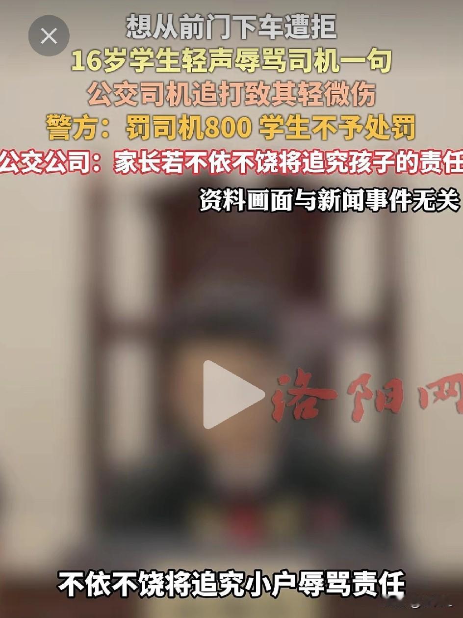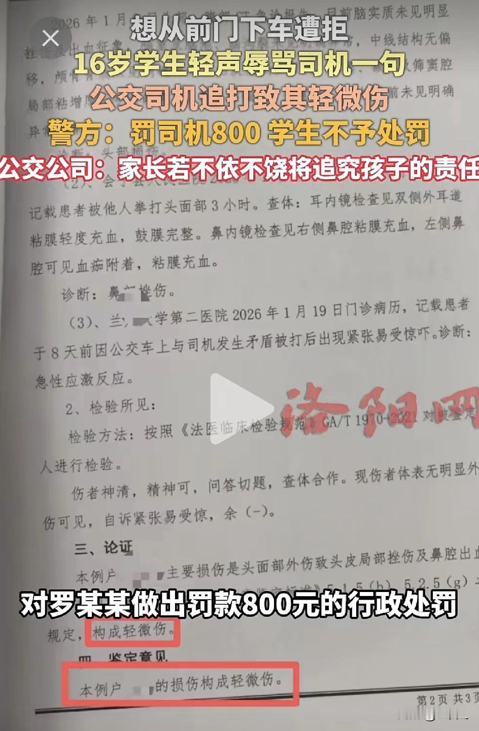一句不文明的话换来一巴掌!甘肃16岁少年公交车上骂司机,被司机追下车打头! 1月11日中午,甘肃会宁县一辆9路公交车上,发生了一件让人意料不到的事。 16岁的小户坐车回家,到站后他习惯性地想从前门下车——以前学生多的时候,司机经常这样开门。 可那天车上人不多,不过十几个人,所以尽管他要求了三次,司机还是拒绝了他的要求。 小户转身往后门走时,低声嘟囔了一句zang话。正是这句zang话,彻底激怒了司机。 监控拍下了接下来的画面:司机解开安全带,打开前门,冲下车,追上已经下车的小户,一把拽回来,抬手就朝小户头上打了一下! 幸亏路人及时上前劝阻,并将两人拉开,整个过程不到一分钟。 后来,小户的父亲报了警。医院检查发现,小户鼻子挫伤,耳朵充血,八天后被诊断出“急性应激反应”、“极重度焦虑症状”。鉴定结果为轻微伤。 公交公司承认司机“处置方法不当”,该报警不该动手。但话锋一转,又说如果家长再“不依不饶”,他们可能追究孩子骂人的责任:“学生娃骂人也违法!” 警方调查后作出决定:司机罚款800元,学生不予处罚。 律师分析得很清楚:司机犯的是“大错”——作为专业人员,情绪失控动手打未成年人;孩子犯的是“小错”——骂人不对,但情节轻微,而且是未成年人,应以教育为主。 截止目前,双方仍然没有达成一致。 视频一经上网,网友们却吵翻了: “司机确实冲动,但孩子骂人在先!” “未成年人骂句zang话就该被打吗?” “公交司机压力大,但动手绝对不对!” “公司说追究孩子责任,这是在威胁家长?” “家长应该感谢司机管教!” “司机负司机的责任,学生负学生的责任!” “家教不行,到了社会可没人会惯着了。” 这件事给我们提了个醒: 1️⃣遇事冷静三秒钟——司机一冲动,工作可能丢,还要赔钱受处罚,亏大了; 2️⃣教育孩子讲文明——公共场合注意言行,一句zang话可能引发大祸端; 3️⃣解决问题走正道——有纠纷找警察,动手永远是最差的选择; 4️⃣企业要有担当——员工犯错要处理,但不能用“追究孩子”来施压。 马上就要过年了,出门在外,多一份理解,少一份火气。司乘双方互相尊重,才是平安出行的基础! 屏幕前的你,怎么看?一起来评一评! 素材来源:洛阳网,侵联删! 带定位晒今日生活 我的今日状态:💰期待暴富 我这里的天气:☀️晴天
