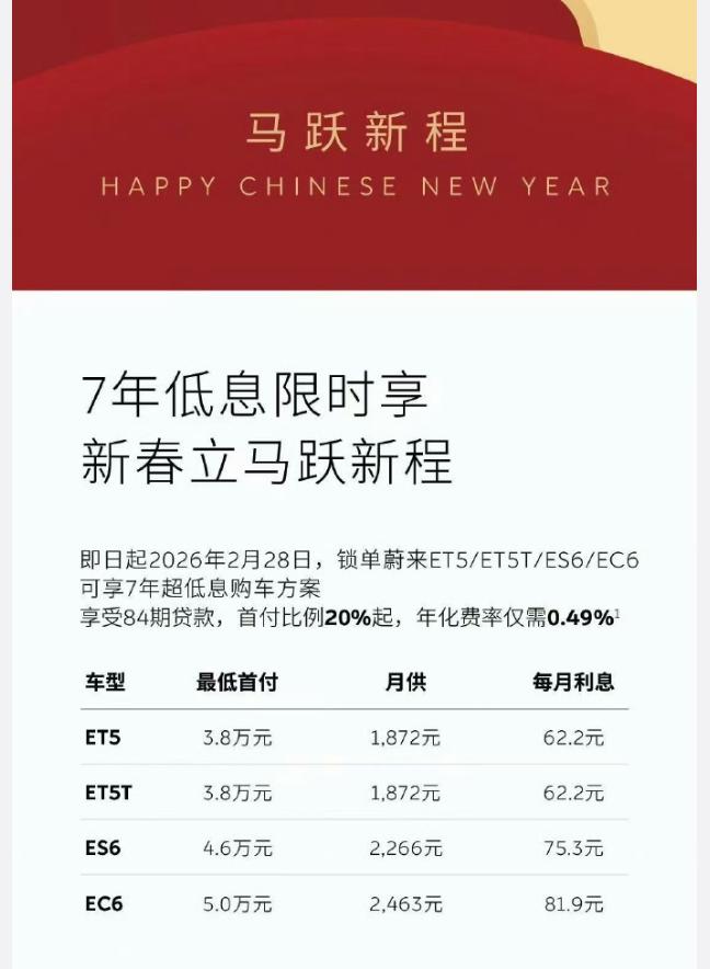 推7年低息的车企又能更新一波了,每家打法还都不一样,蔚乐萤三家都有方案,玩的就是面儿广、车型覆盖多,蔚来和乐道能做到0.49%的年化费率,行业里很低了;极氪7年超低息,年化率1.99%,007、007GT、009有专属7年方案,前5年0息,后24期年化率在2.5%;东风日产是8年低息,首付0元,日供最低27元把车开回家,一杯咖啡的钱。好家伙,这下咱讨论的不是一台车能开多少年了,因为8年贷款都来了......【来自懂车帝车友圈】