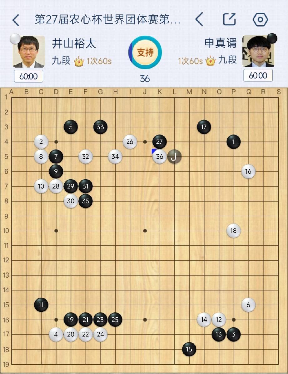农心杯第12局盘,申真谞攻擂井山裕太! 2月4日,第27届围棋农心杯第12盘比赛,申真谞执黑以对角小目开局(黑1右上小目、黑3左下小目),这是相对少见的布局方式,意图避开井山裕太熟悉的AI布局套路。白棋(井山)以两个星位应对,形成对角型格局。 前36手双方基本完成了布局,形成了实地与外势相对均衡的局面。井山裕太虽然主动求变,但申真谞应对得当,没有给对手可乘之机。这种布局方式的选择,更多是双方针对对手特点的"心理战"和"战术调整",而非标准定式套路。