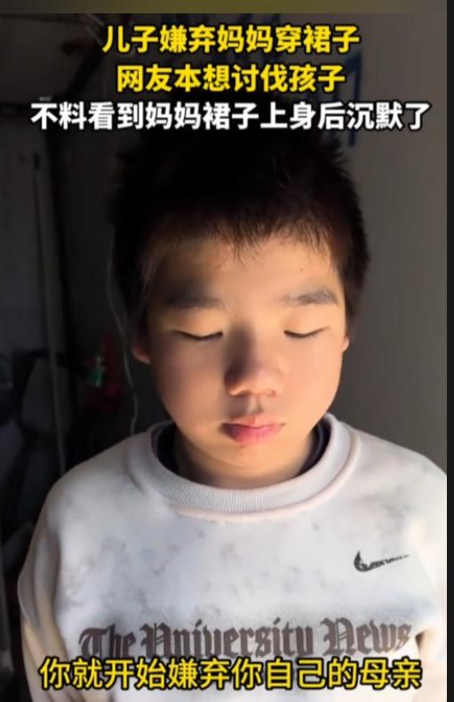 福建,一儿子嫌弃妈妈穿裙子。开始,挺心疼这妈妈。镜头一转,挺心疼这娃。只能说,孩子,你的嫌弃是对的。这一届大人真难带! 脸那么漂亮,但红色西装外套,配个白色布裙,里面还搭了一条横纹睡裤。这穿搭,不嫌弃都不是正常人了吧。 事实证明,孩子的审美没有问题,穿成这样,不嫌弃才怪。妈妈这是故意玩梗的吧。