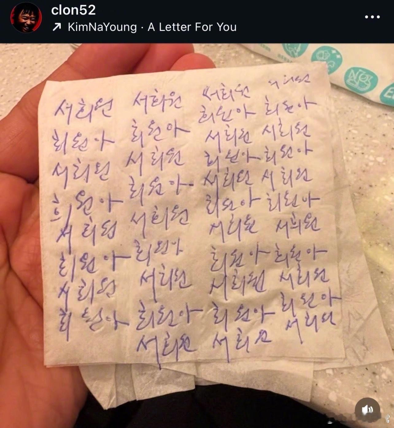 具俊晔队友姜元来发文,说在休息室里看到具俊晔在纸巾上一直写东西,近距离一看,整张纸上写满了徐熙媛的名字