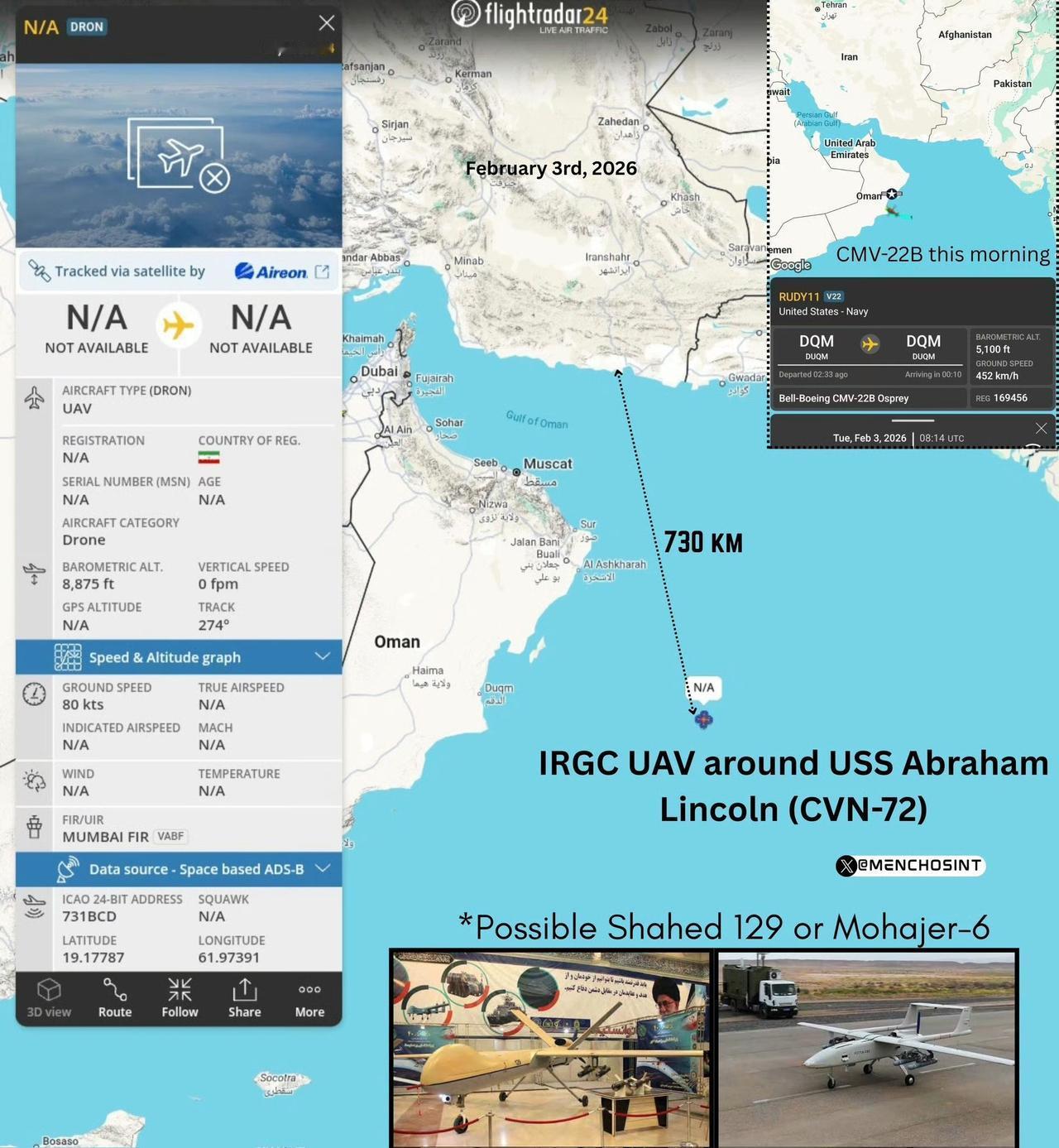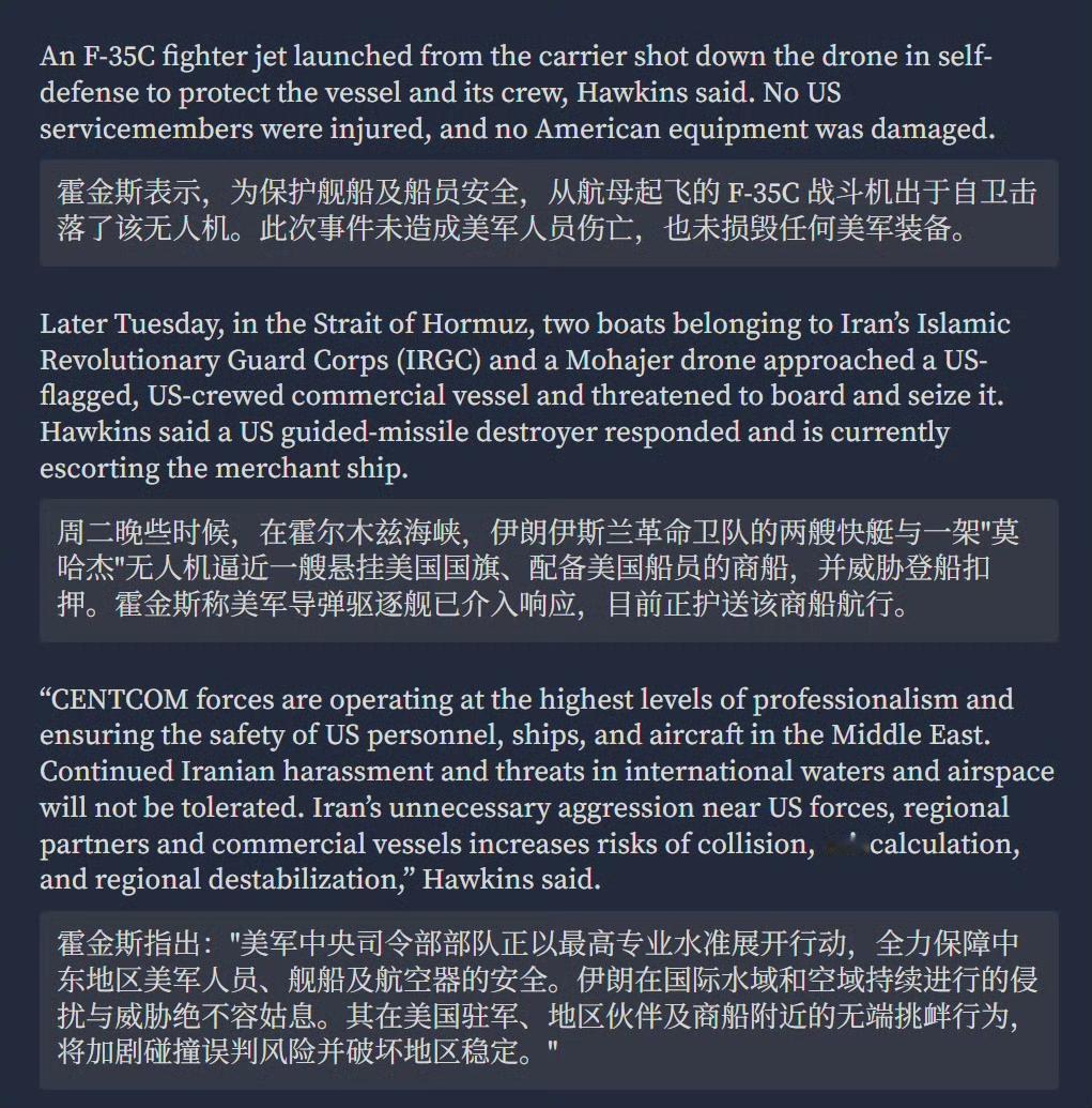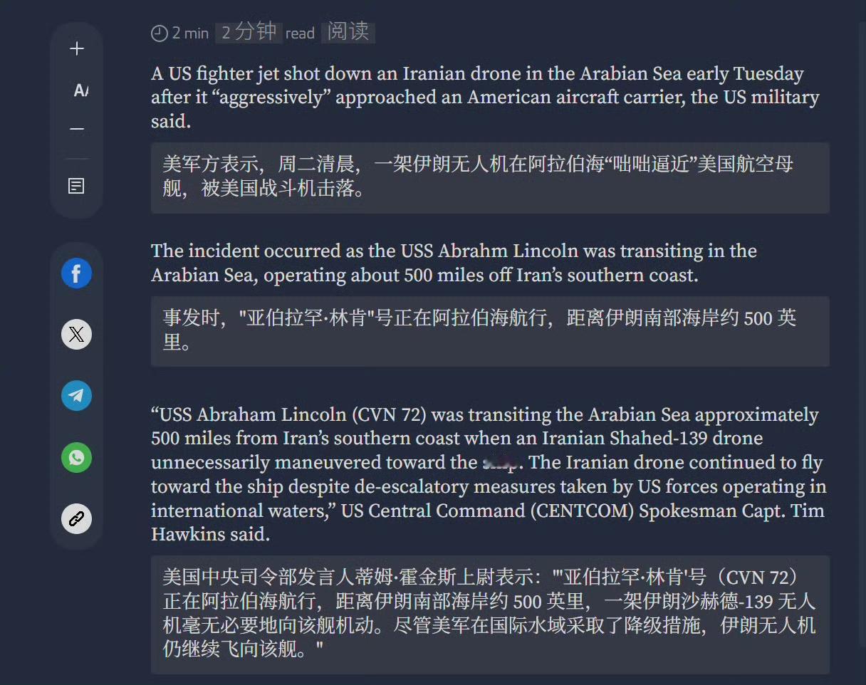 美国F35战机击落伊朗无人机,伊朗称无人机已成功完成侦查拍摄。 2月3日,美军中央司令部官方账户发布消息称,美国海军林肯号航母的F-35C战机在阿拉伯海上空击落了一架伊朗的Shahed-139型无人机,原因是该无人机不听警告、咄咄逼人地靠近美军航母。 而伊朗方面则表示,自己的一架无人机3日在公海执行常规合法侦察任务过程中失联,但已成功传回其拍摄的图片。 联系到前几天伊朗公布的无人机拍摄林肯号航母的图片来看,美国的航母的确一直处于伊朗的监控之下。 其实,这对美国来说是一件很尴尬的事情,现代战争讲究“发现即摧毁”,美方作为进攻方,在战前最重要的部署就是隐藏航迹,这样才能确保自身安全和进攻的突然性,如果像现在这样,时刻处在敌人的监控和打击范围之内,还谈什么武力威慑,甚至人们可能要问一句,到底谁在威慑谁?