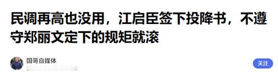 民调再高也没用,江启臣签下投降书,不遵守郑丽文定下的规矩就滚 2月2号凌晨两点,全台湾大多数人还在被窝里睡大觉,台中市的夜色里却藏着一场政坛大戏,刚在1号当选台“立法院副院长”的江启臣,在自己的办公室里来回踱步,烟灰缸里的烟蒂堆成了小山,最终还是咬着牙拿起笔,在国民党中央的提名协议书上签下了自己的名字。 这一签,等于宣告这位被无数人看好的“明日之星”,彻底向国民党主席郑丽文缴械投降,之前喊的“参选到底”“躺着也能赢”,全成了让人笑话的空话。谁能想到,就在签字前几天,江启臣还是全台湾最风光的政治人物之一。 TVBS刚出炉的民调数据里,他的支持率直接飙到54%,这可不是小数字,比党内竞争对手杨琼璎高出整整34个百分点,就连民进党推出来的参选人何欣纯,都被他甩了38个百分点,说是“碾压级优势”一点都不夸张。 更别提背后的靠山有多硬:前台中市市长胡志强,那可是在台中深耕多年的“老招牌”,公开说“江启臣是台中最合适的带头人”;“战斗蓝”教主赵少康,天天在节目里为他摇旗呐喊,称他是“国民党新生代的希望”。 就连刚和他搭档当选台“立法院长”的韩国瑜,都在公开场合表态“全力支持江启臣参选”。基层更是热闹,台中几十位里长天天堵在国民党中央党部门口,举着“非江启臣不投”的牌子请愿,那阵仗,仿佛江启臣已经稳坐台中市市长的宝座。 郑丽文去年11月就在中常会上拍板了2026年县市长提名办法,核心就两条:一是现任者可以直接征召,二是有多个候选人的县市,先由党内协调,协调不成再谈其他方式,而且还要和民众党搞“蓝白合作”,提名权得由两党协商小组说了算。 说白了,郑丽文定的规矩就是“党决定一切”,不是你民调高就能上。江启臣一直坚持要“全民调决定提名”,这其实就是和郑丽文的规矩对着干。 江启臣会深夜妥协,其实也有自己的难处。刚在2月1号当选台“立法院副院长”,正是政治生涯的上升期,他可不想因为一场市长提名,就和党主席撕破脸,被党内边缘化。 而且国民党现在主打“团结抗绿”,郑丽文一直强调“不要内耗”,江启臣要是硬刚,很可能被扣上“破坏党内团结”的帽子,到时候不仅市长参选不成,连刚到手的立法院副院长位置都可能坐不稳。 再说,那些支持他的大佬,看似声势浩大,其实也不想得罪郑丽文,胡志强早已退居二线,赵少康需要党内资源支持“战斗蓝”,韩国瑜刚当选立法院长,得和党主席保持默契,没人真会为了他和党内权力核心硬刚。 所以那天凌晨,江启臣在办公室里想了一夜,终究还是认怂了。 签字之后,他3号接受采访时还嘴硬说“大家都是国民党同志,要方向不要猜忌,要确定不要内耗”,可明眼人都知道,这就是给自己找台阶下。这场妥协,看似是江启臣个人的让步,其实暴露了国民党骨子里的问题:这个党从来不是靠民意运作,而是靠派系平衡、权力博弈。 民调再高,只要不符合党内大佬的利益,不符合党主席定的“规矩”,照样得靠边站。 最可怜的还是那些支持江启臣的基层民众,之前天天堵在党部门口请愿,以为自己的声音能改变结果,没想到最后还是被党内的“规矩”碾压。 有台中里长私下吐槽:“我们选出来的民调不算数,党主席说谁行谁就行,这还选个啥?” 这种失望,很可能会让国民党在台中的支持率下滑——毕竟基层选民投票是看自己认不认可,不是看党内定了谁。 而郑丽文通过这一手,算是彻底巩固了自己在党内的权威。她用“规矩”压服了民调领先的江启臣,既展现了党主席的掌控力,又能推进和民众党的合作,可谓一举两得。 但这种“权力大于民意”的操作,也埋下了隐患:如果最终提名的候选人不是民心所向,就算有“蓝白合作”加持,也未必能打赢民进党。 毕竟选举的本质是争取选民,不是平衡党内权力。 说到底,江启臣的妥协,就是国民党体制僵化的缩影。在这个党里,你可以有高民调,可以有大佬支持,但只要触碰了党内的权力规则,就得乖乖低头。 “民调再高也没用”这句话,在江启臣身上体现得淋漓尽致。而这种只讲规矩不讲民意的做法,最终伤害的不仅是个别候选人,更是整个党的公信力。 接下来,国民党能不能靠这种“协调出来”的候选人打赢选举,还很难说,但可以肯定的是,要是继续把党内规矩看得比民心还重,迟早会被选民抛弃。毕竟,选民投票是为了选自己想要的人,不是为了遵守某个政党的“规矩”。