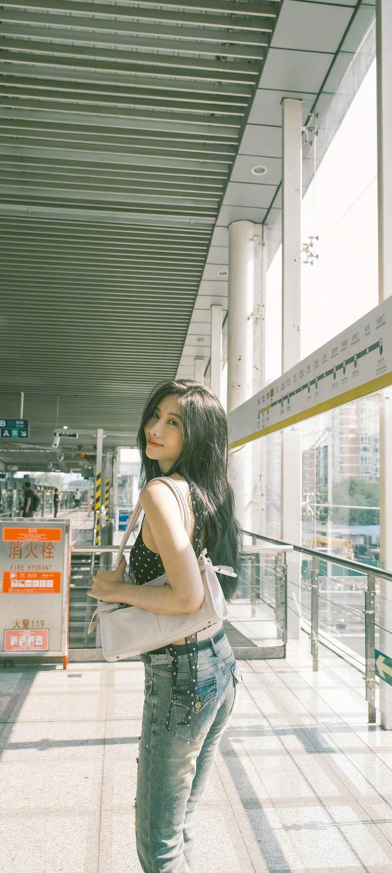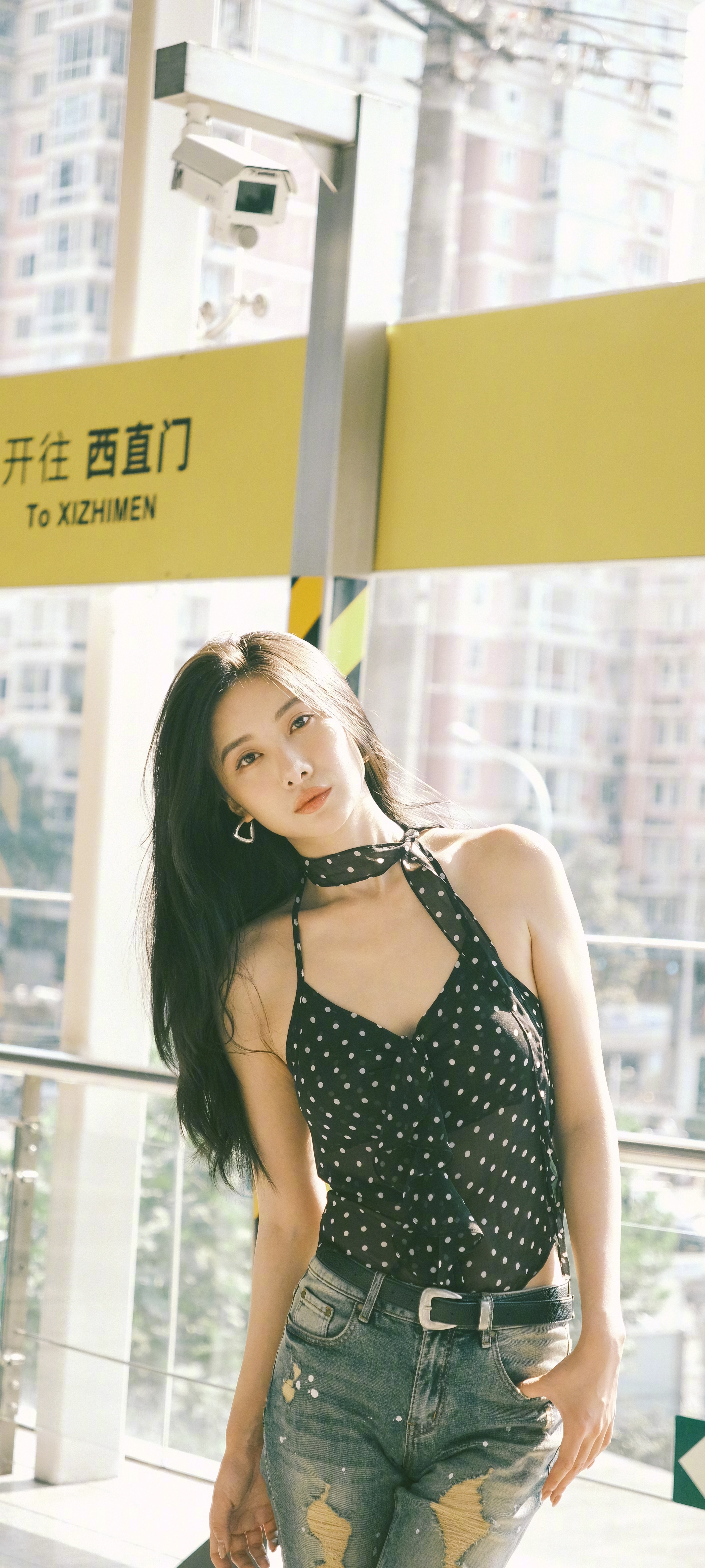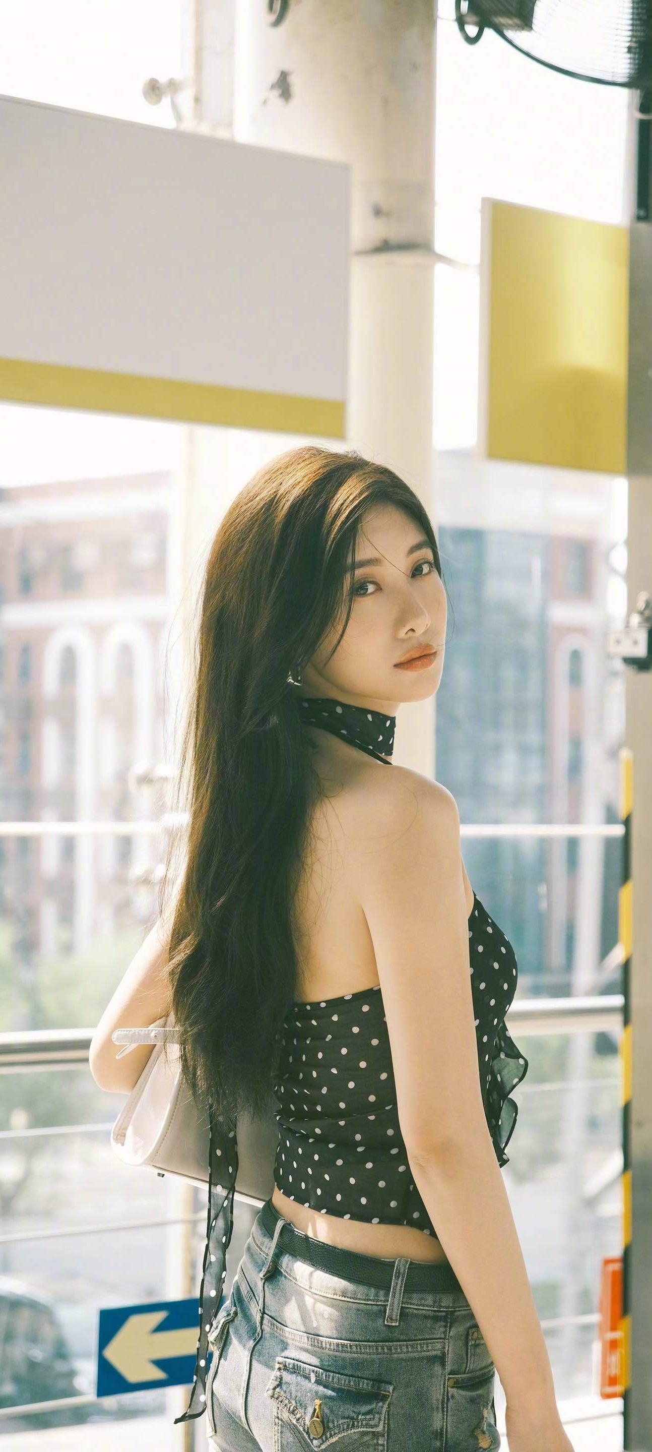 吴优穿搭壁纸,长发朱唇波点吊带牛仔,明媚怡人的感觉。吴优