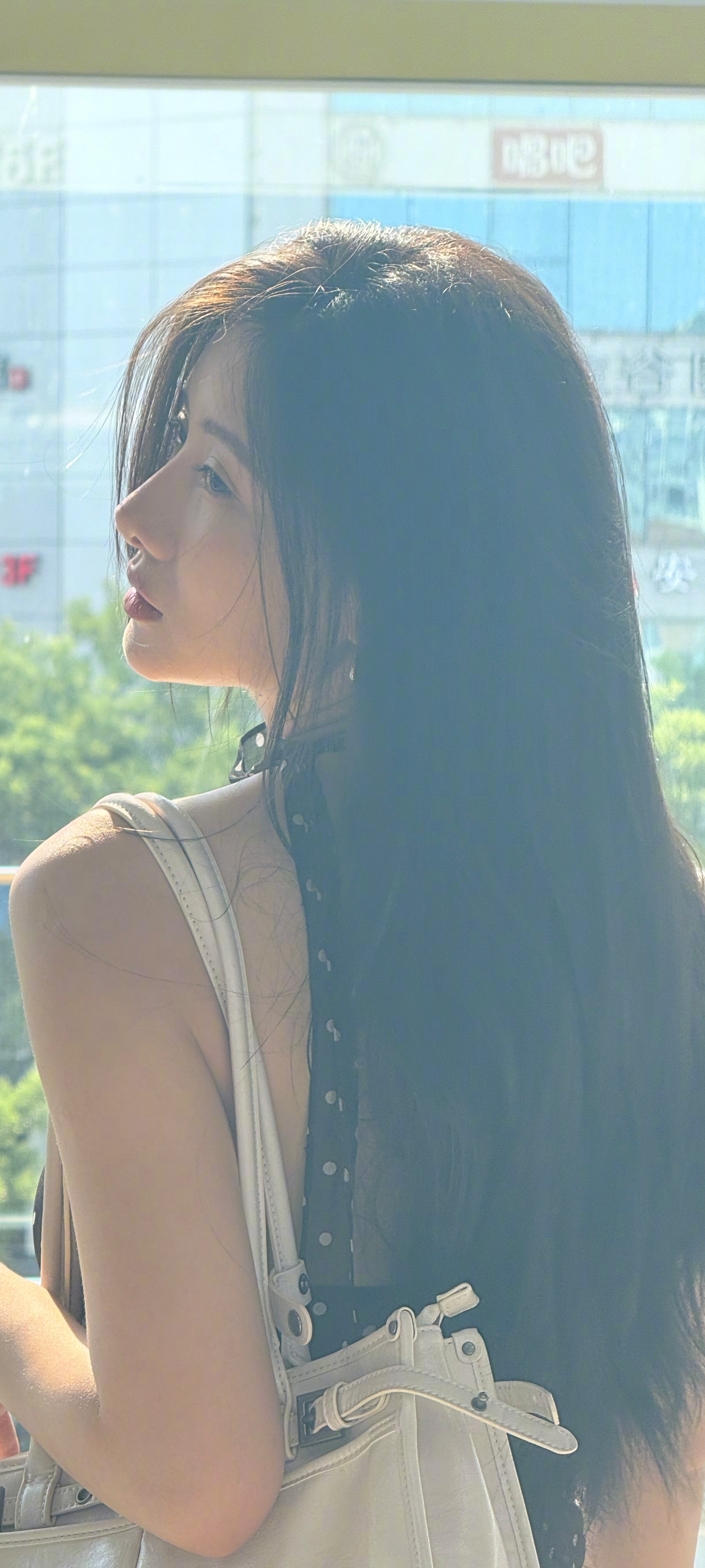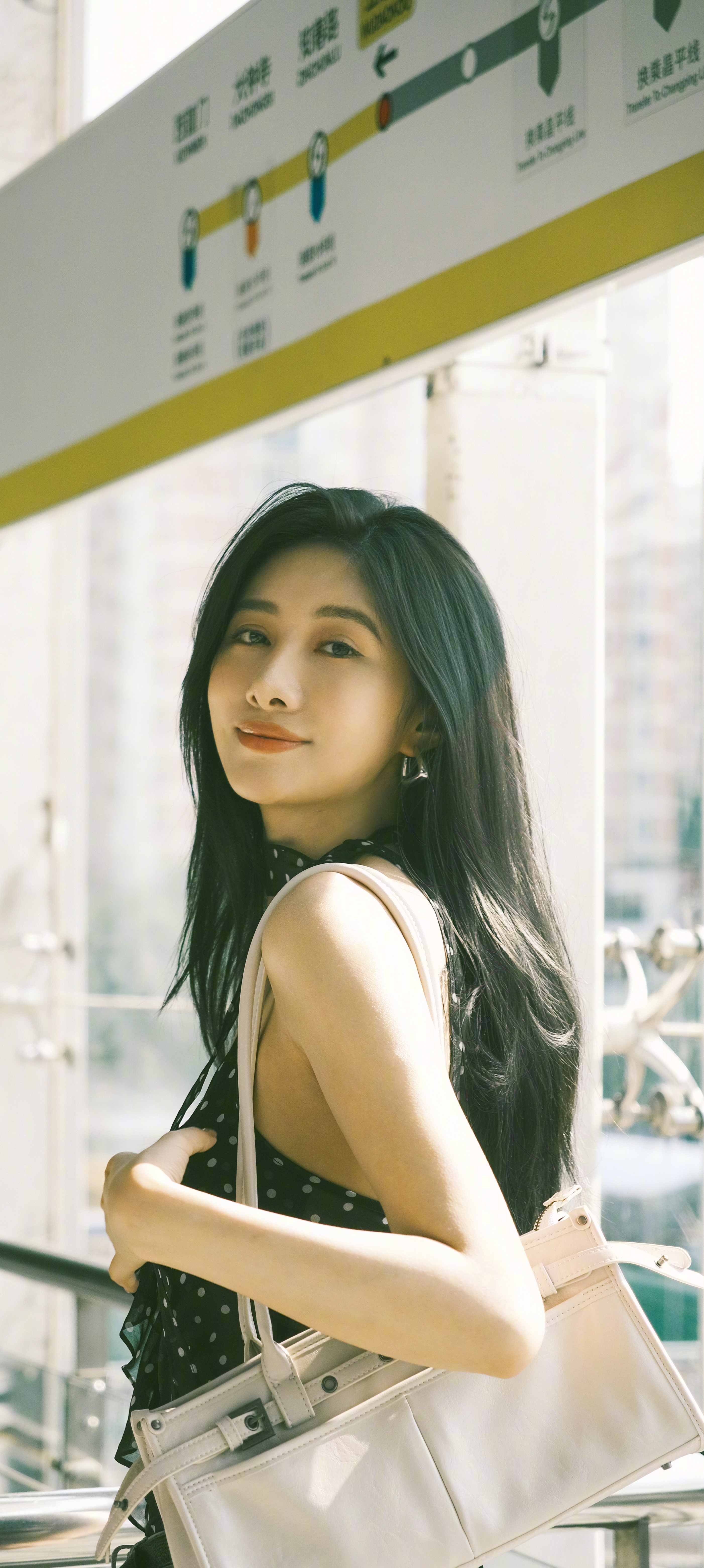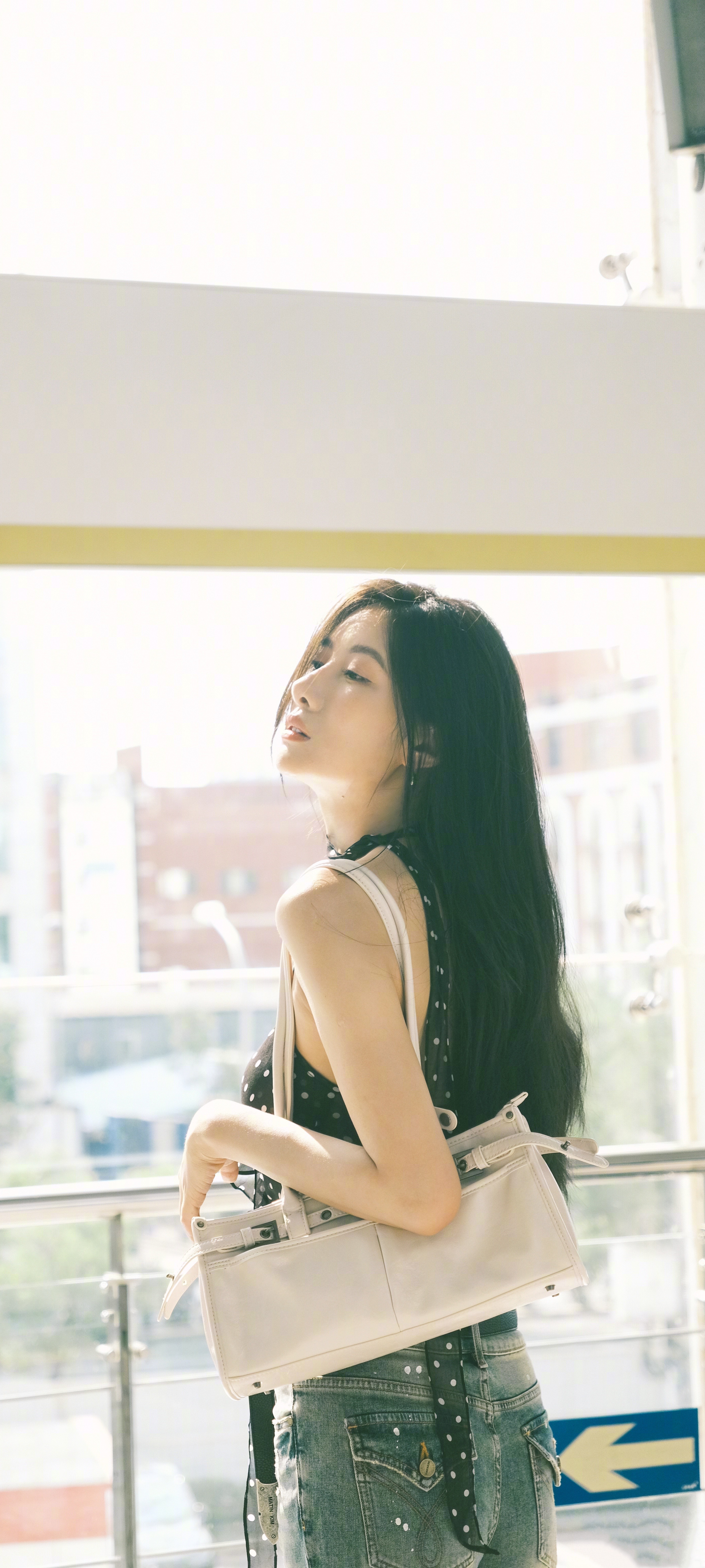 吴优穿搭壁纸,长发朱唇波点吊带牛仔,明媚怡人的感觉。吴优